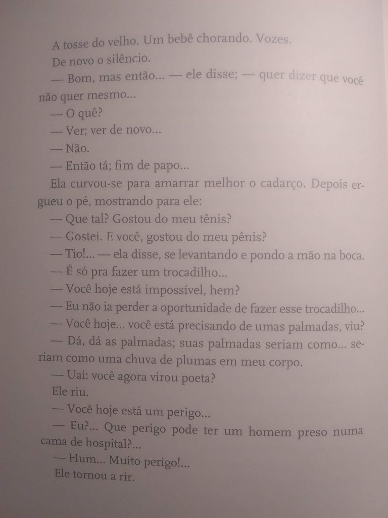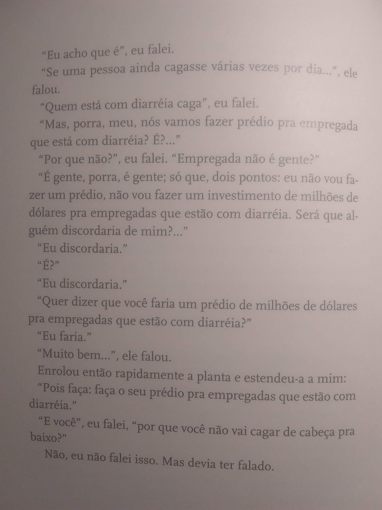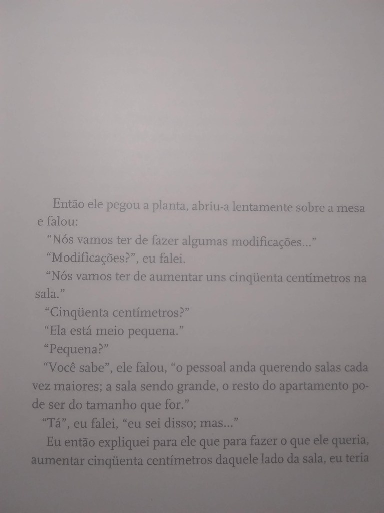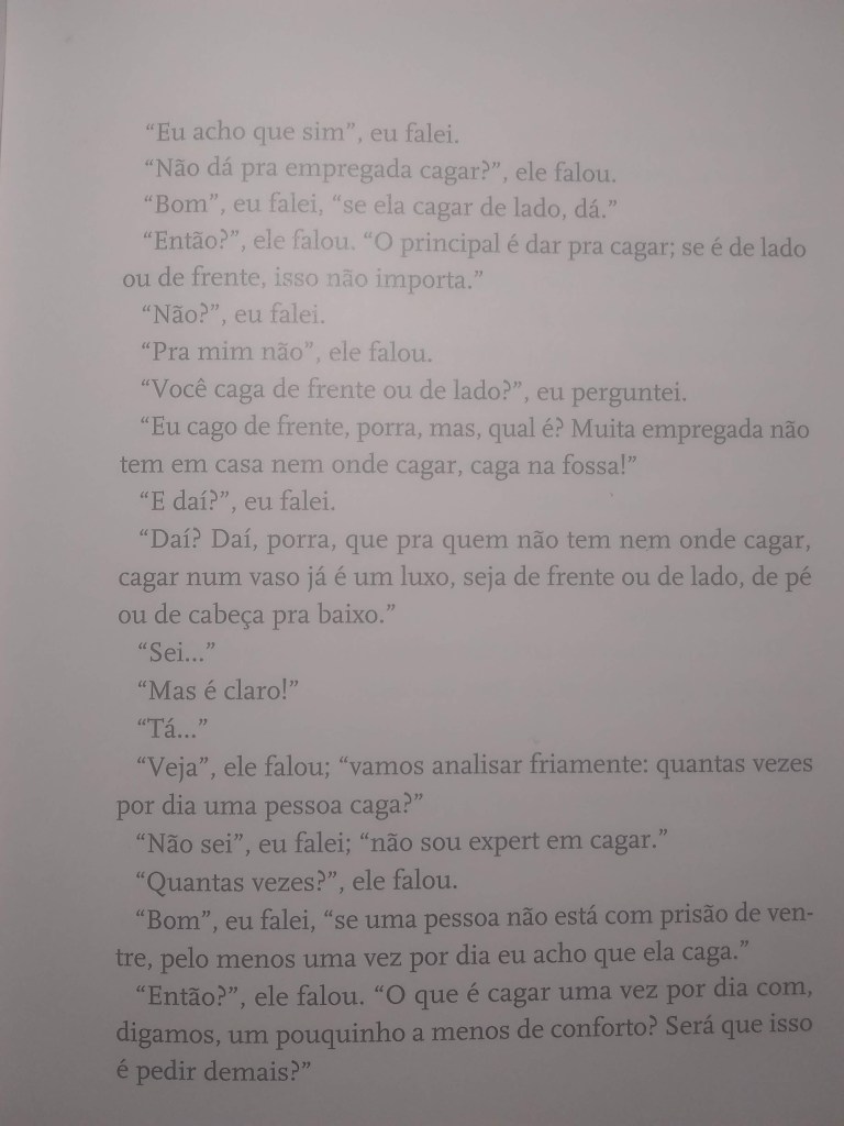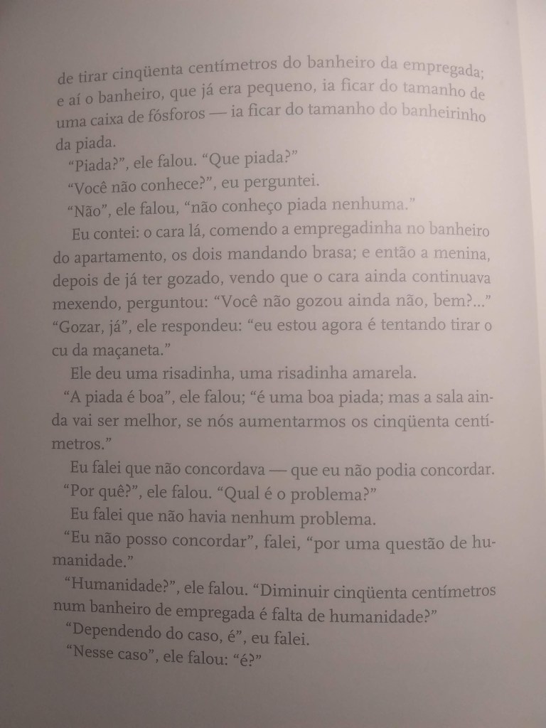 No conto “Luxo”, um diálogo prosaico a respeito do tamanho que deve ter um banheiro em um apartamento expõe o velho funcionamento da casa grande & senzala, bem como o mecanismo do velho ditado “manda quem pode, obedece quem tem juízo”. O brilho da narrativa é expor, por trás de um diálogo supostamente engraçado, o modus operandi do nosso perverso sistema social. Repare que, mesmo sendo claro, se atendo ao indispensável, Vilela não se apoia em gírias, expressões fáticas ou palavras vazias – mas ainda assim temos acesso sutil à psicologia de cada personagem. Ele vai direto no ponto, mas apesar de rápido, não é raso. Uma dica: ele mais diz pelo que ele não diz – “a decantação da linguagem não está só na imitação da fala, mas também no uso estratégico das pausas e na escuta apurada do silêncio”, no dizer de Augusto Massi.