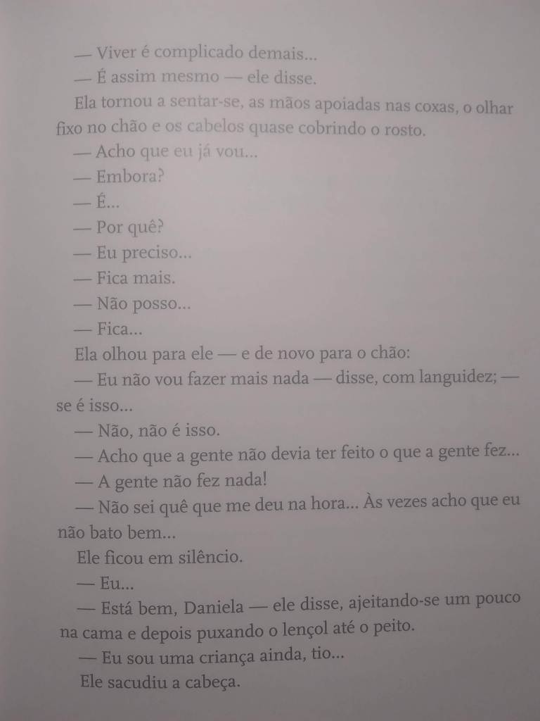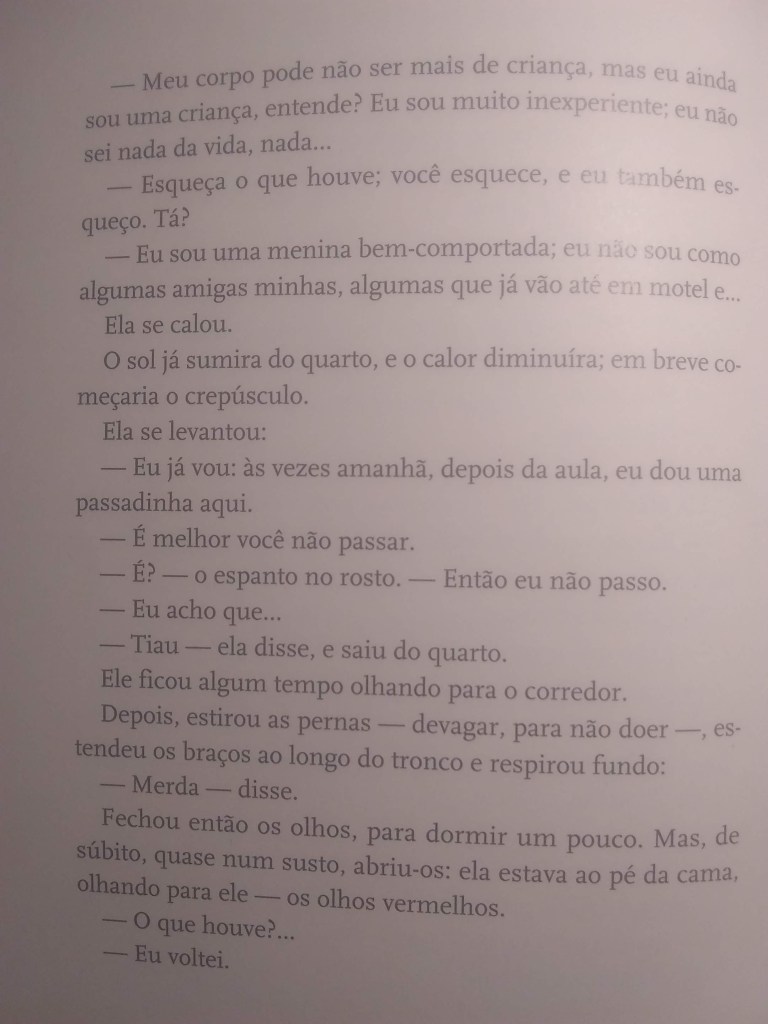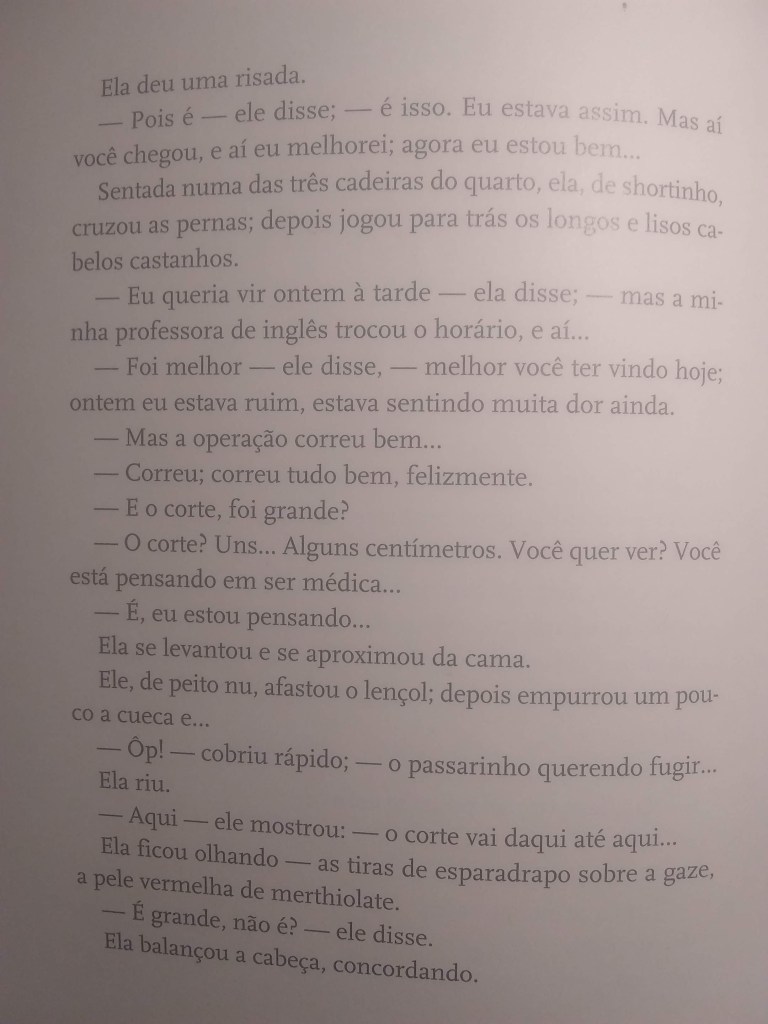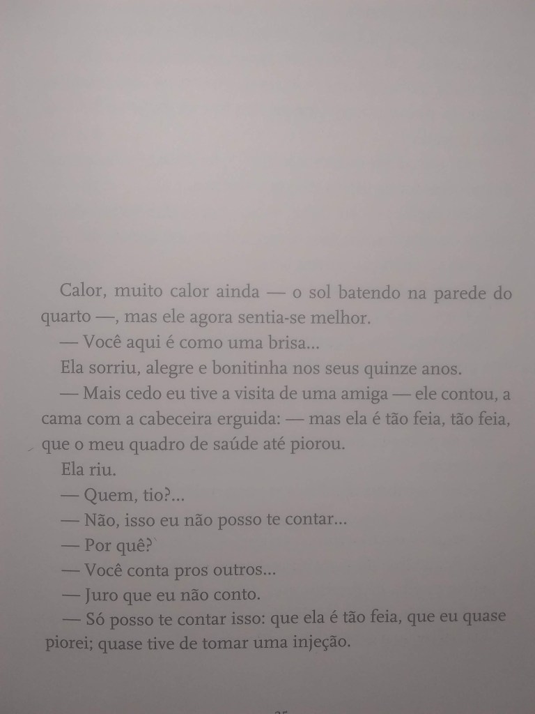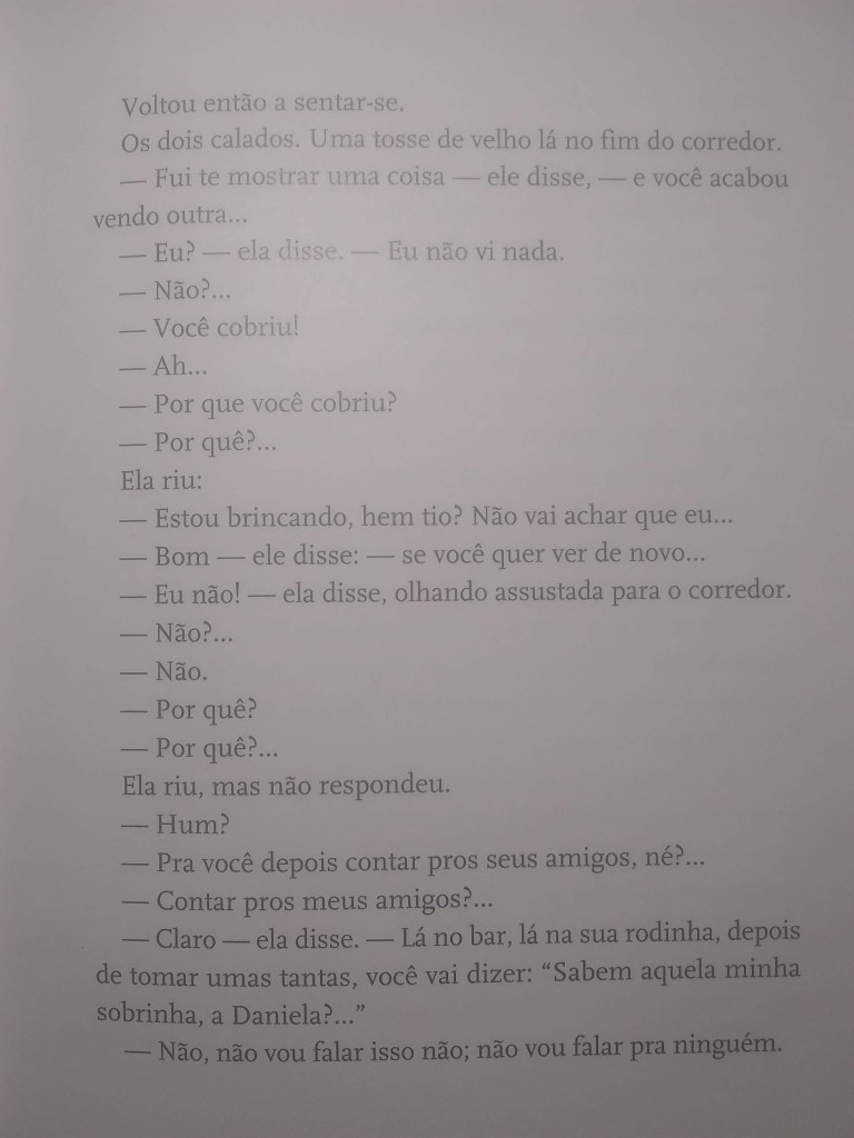 Repare como, tanto no conto “Luxo” quanto “Calor”, as duas histórias vão se entrelaçando sutilmente, até desembocar no desfecho implacável. “Calor” aborda um tema difícil: o relacionamento entre uma garota adolescente e seu tio, bem mais velho. A sedução de um quarentão em quarentena é ambígua – estará ele seduzindo ou sendo seduzido? Quem detém o poder, o velho ou a garota? Quem domina esta situação? Estamos vendo um abuso ou um jogo? Temos em um nível a sedução do tiozão e no segundo nível a criação do perfil psicológico da garota: afinal, quem está seduzindo quem, a garota, o tiozão – ou o texto, que nos faz bisbilhotarmos essa cena pelo buraco da fechadura?