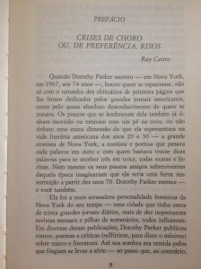 A ironia é essa dupla operação da linguagem em que dizemos e não dizemos ao mesmo tempo. Como o mineiro da piada, o irônico diz que vai pra Curvelo pra gente pensar que ele vai pra Cordisburgo, mas ele vai é pra Curvelo mesmo. Em Parker, a ironia está na própria estrutura de cada narrativa. Com ouvido absoluto para as armadilhas da oralidade, ela constrói um texto aparentemente informal que fala muito mais nas entrelinhas do que à primeira vista.