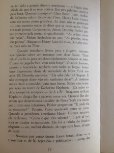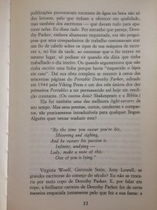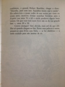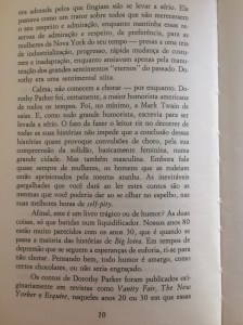 Curioso como no atual zeitgeist feminista ninguém fale de Dorothy Parker. Ou melhor, entendo: Parker foi feminista bem antes de virar modinha. Suas narrativas invariavelmente retratam mulheres superficiais, burras, obcecadas por seus maridos, filhos e amantes, fúteis, reclamonas, sonhadoras, dominadoras, chatas, sentimentais, bipolares, venenosas, destruidoras – e engraçadíssimas. Desinteressada de militâncias e mais focada nas nuances psicológicas, Parker combatia o machismo por dentro, revelando, através dos estereótipos de suas personagens, as estruturas sociais que as aprisionavam em determinados papéis e convenções.