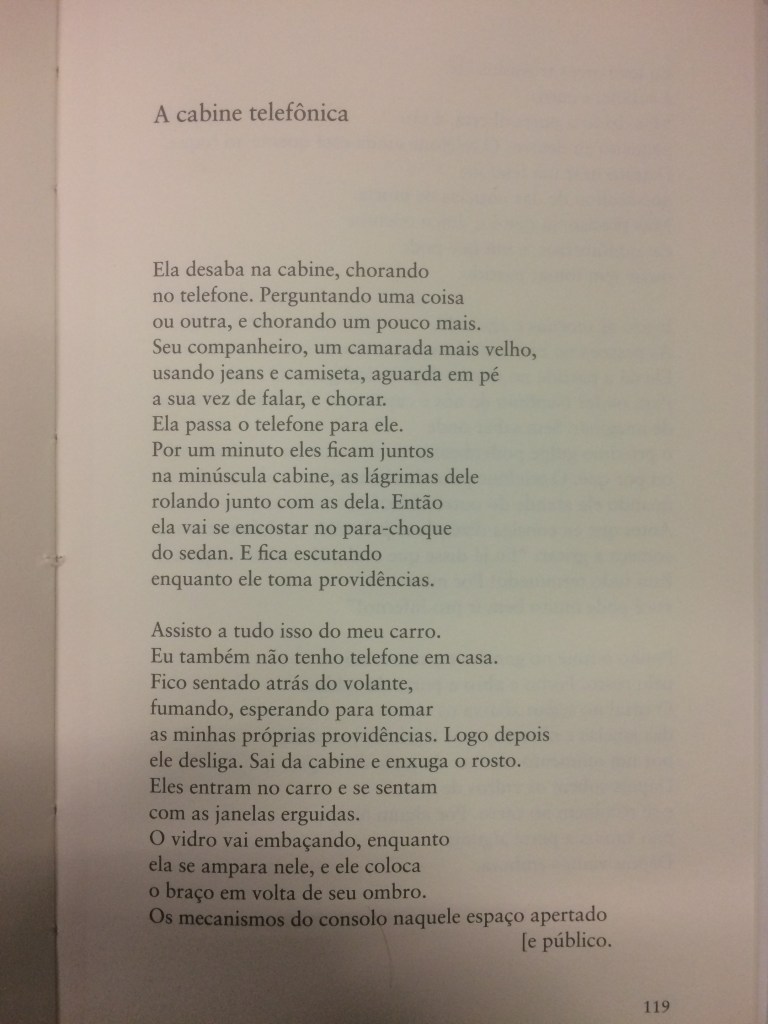 Recentemente Raymond Carver, um dos grandes contistas norte-americanos da segunda metade do século 20, teve publicada no Brasil uma seleta de poemas (Esta Vida, 34). Sua poesia, bem como sua prosa, é seca, porém aberta à emotividade. No entanto ambas têm algo em comum: sempre partem de uma imagem, de uma cena. Seu estilo foi chamado de “minimalista” pelo fato de Carver arrancar sentimentos de imagens visuais nítidas e diálogos naturalistas. Vejamos estes poemas.