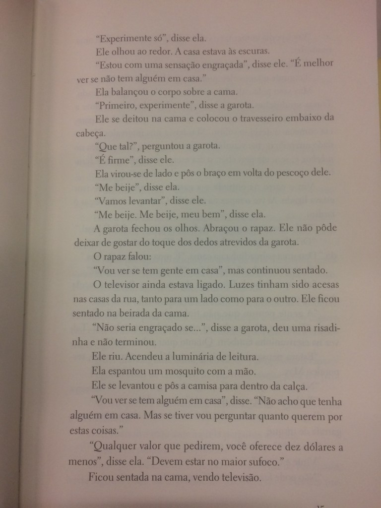 Bem, é isso o que você vai fazer. Vai criar um conto baseado em uma cena específica. Primeiro pense na cena. Imagine a cena. Depois, a partir desta imagem, expanda sua narrativa. Para isso, você vai introduzir personagens conversando. Poucos personagens.