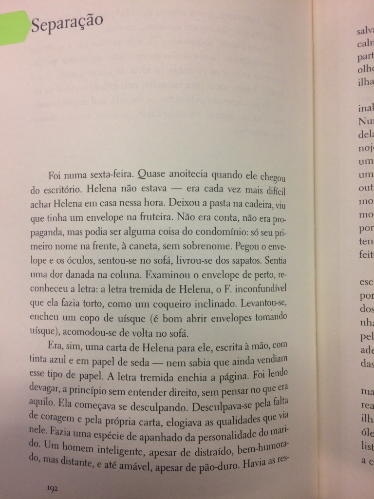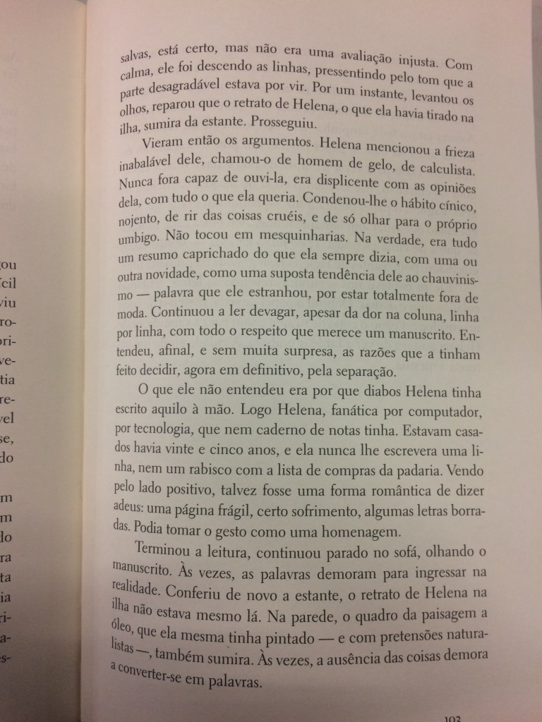 Neste conto, Marcílio conta indiretamente o fim de uma história de amor, ao enquadrar um homem de meia-idade que lê a carta de despedida da mulher – e percebe que o casamento talvez tenha terminado 20 anos antes. A cena em que a leitura se desenrola é simples mas eficaz. A mulher o acusa de ser um homem gelado ao mesmo tempo em que o homem coloca gelo em seu uísque, como quem saboreia o momento do pé na bunda. Sutis descrições do apartamento do personagem nos dão uma ideia de como funciona ou não funciona a relação entre o personagem e sua mulher. O ritmo calculado demonstra a dificuldade que o personagem tem em ver a ficha caindo.