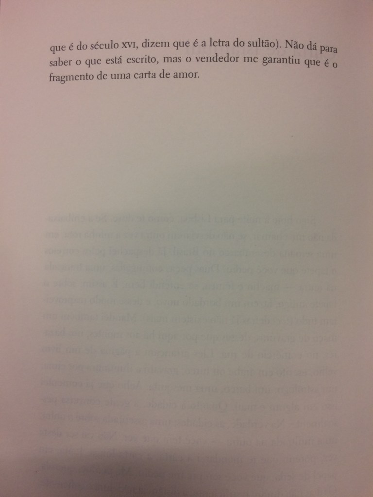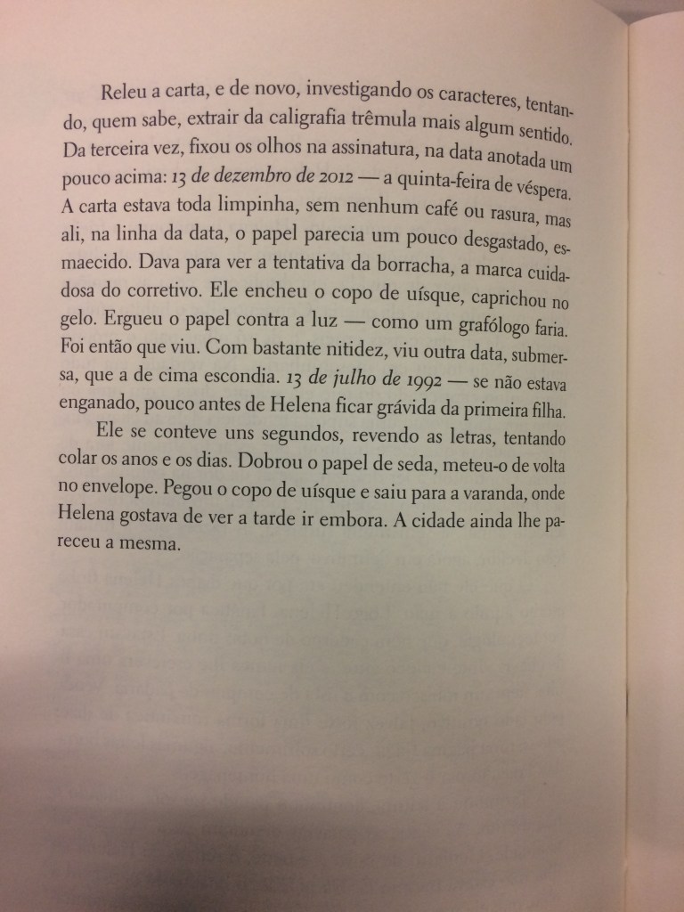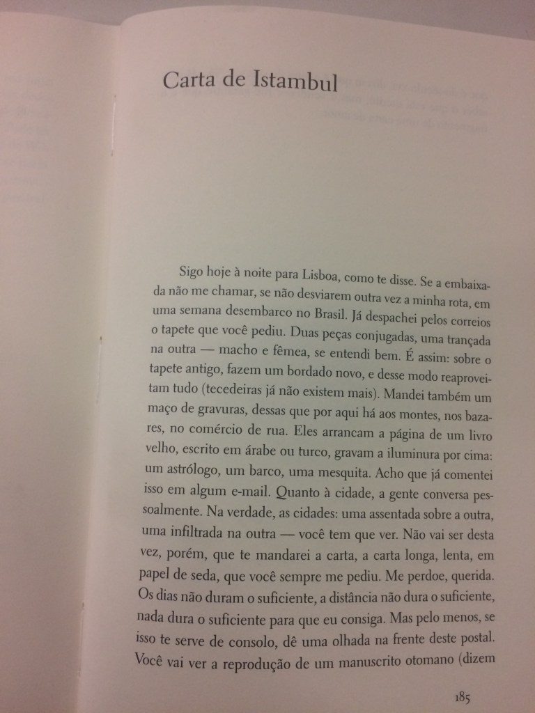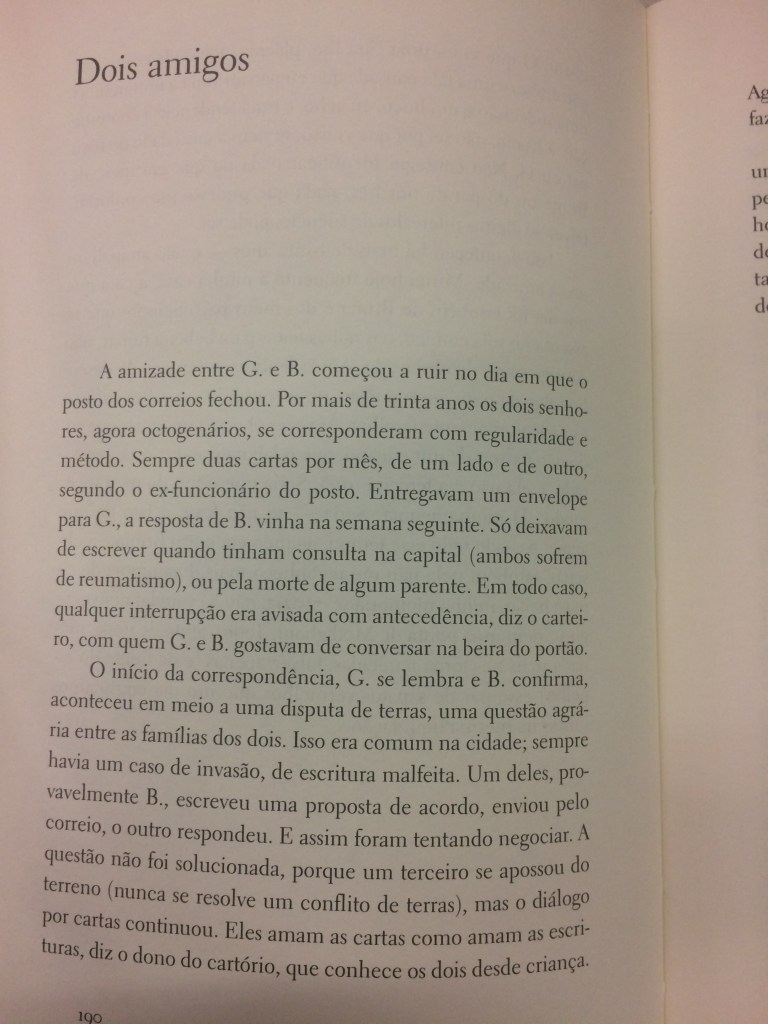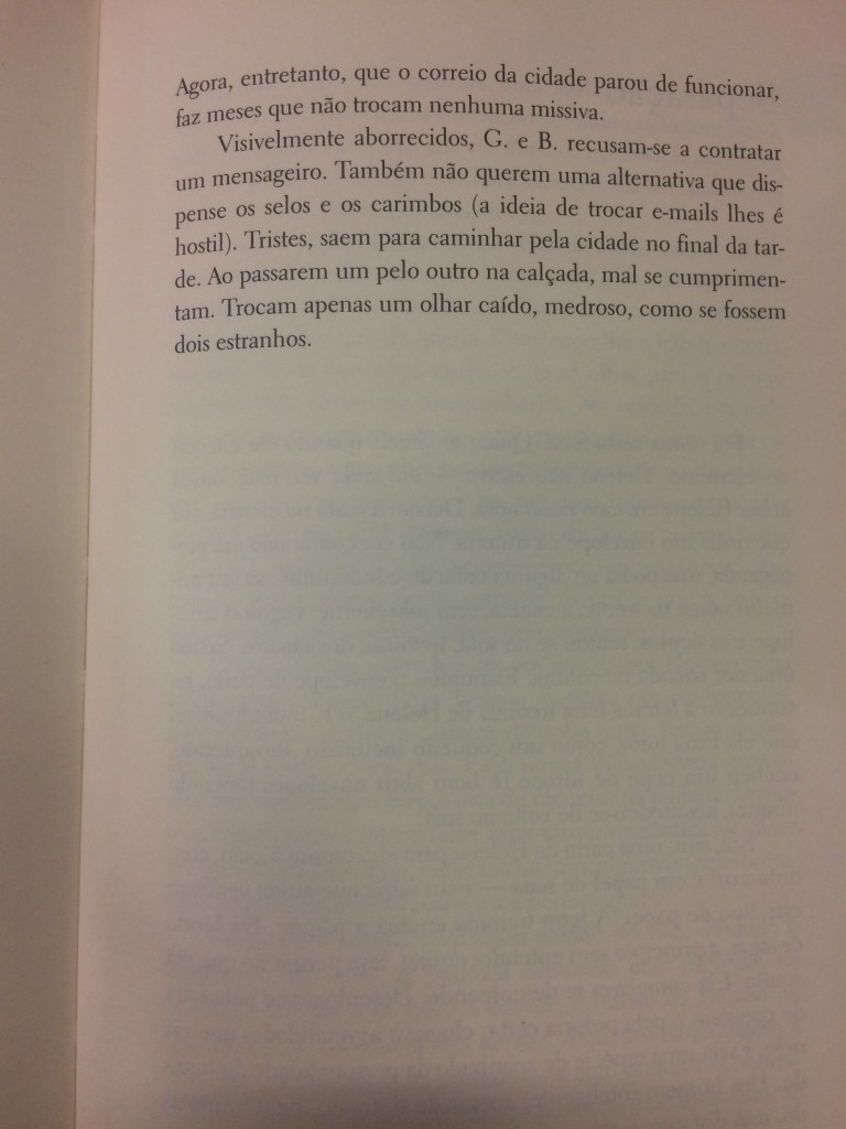 No seu conto, você vai usar a mesma estrutura. Um personagem recebe uma carta e lemos a carta indiretamente, através de sua leitura. A cena em que se constrói a leitura da carta também é marcante para a narrativa – a descrição do ambiente, o uso do tempo.