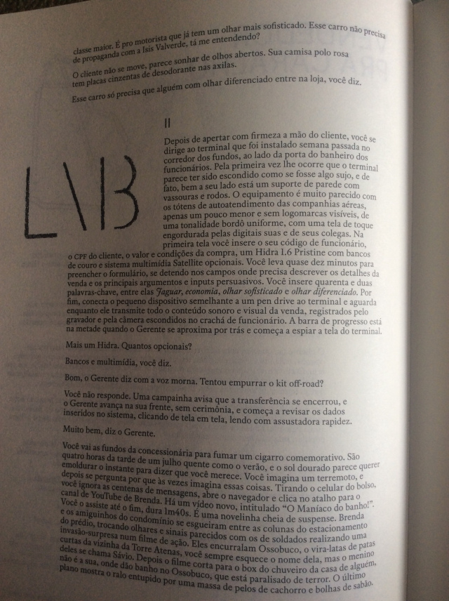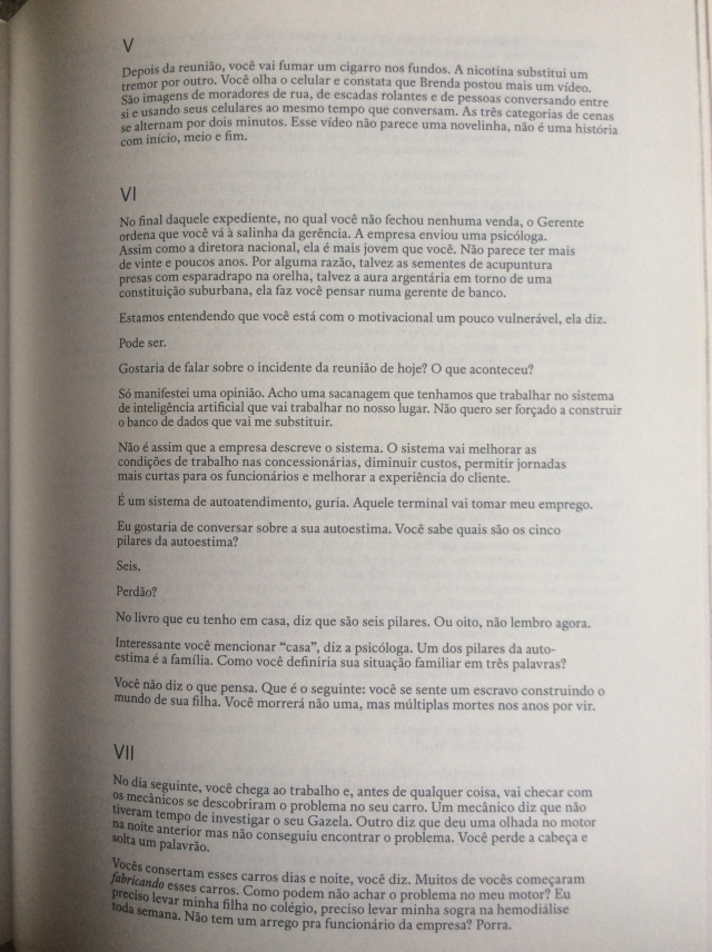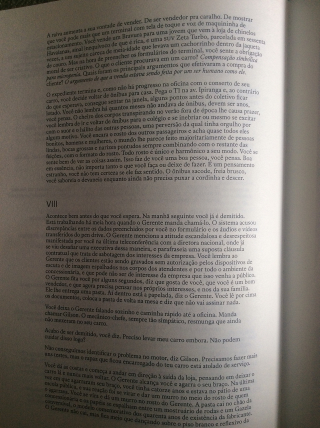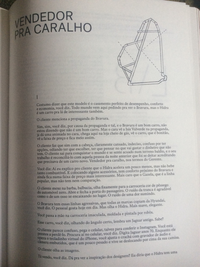 É um “eu” emparedado entre vários vocês. É importante lembrar que todo vendedor está sempre se dirigindo a um “você”: sua razão de vida é a satisfação de seu cliente, “você em primeiro lugar”. O desfecho é um primor de epifania profana, uma sugestão de que a beleza pode vir daquilo que parece inútil, desnecessário, lixo.