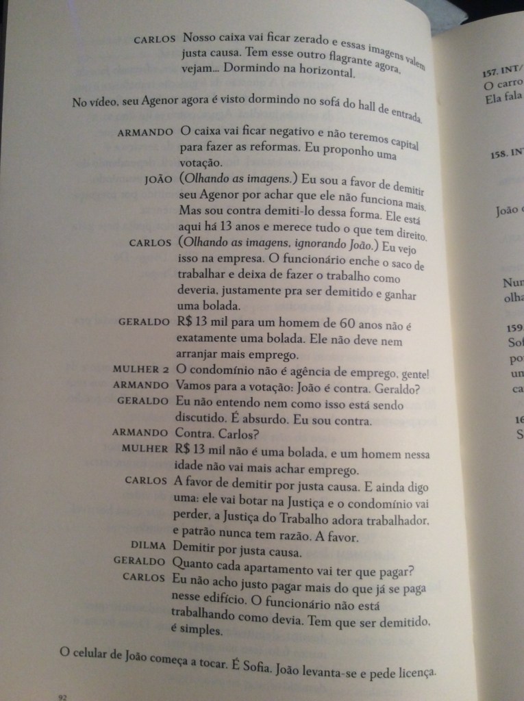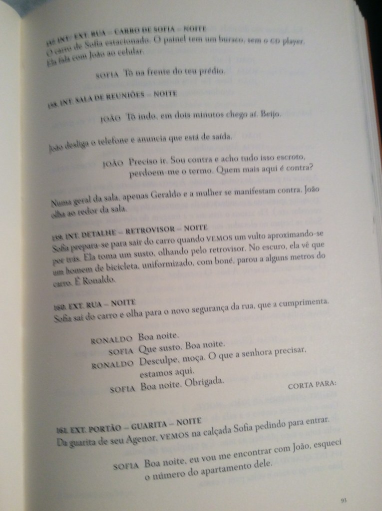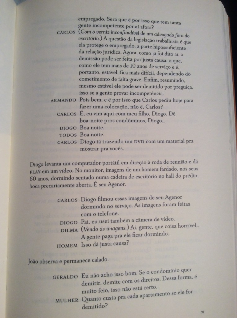 O trecho selecionado é praticamente um curta-metragem de terror dentro da impressionante comédia de costumes que é O Som ao Redor. Curiosamente eu achava mais longo no filme do que no roteiro – tem só 4 páginas. A cena é uma reunião de condomínio que trata da demissão de seu Agenor, o sexagenário vigia do prédio. Pela frieza com que é conduzida pela maioria dos moradores, parece mais um plano de execução, ou de expiação coletiva. Está em Três Roteiros (Cia das Letras).