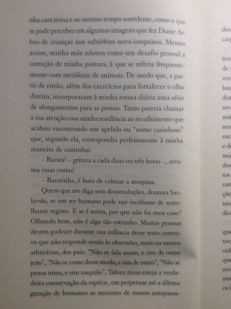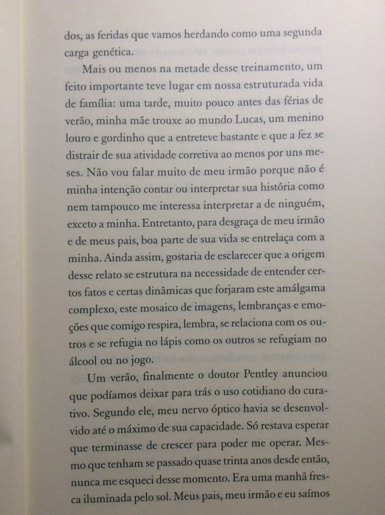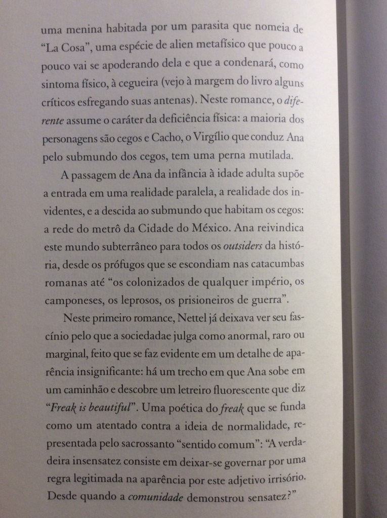 O romance é um bildungsroman clássico, ou seja, narra a vida da personagem desde sua infância até sua maturidade, e a forma é a de solilóquio narrado para um terapeuta. A narradora nasceu com uma mancha no olho que ao mesmo tempo que a marca também mancha a sua percepção sobre o mundo. E é nesta dupla função que Nettel estabelece a poética do freak: aquele que tem uma característica diferente da suposta normalidade não só é visto, percebido e tratado como um diferente, mas também vê, percebe e trata a realidade de um jeito diferente.