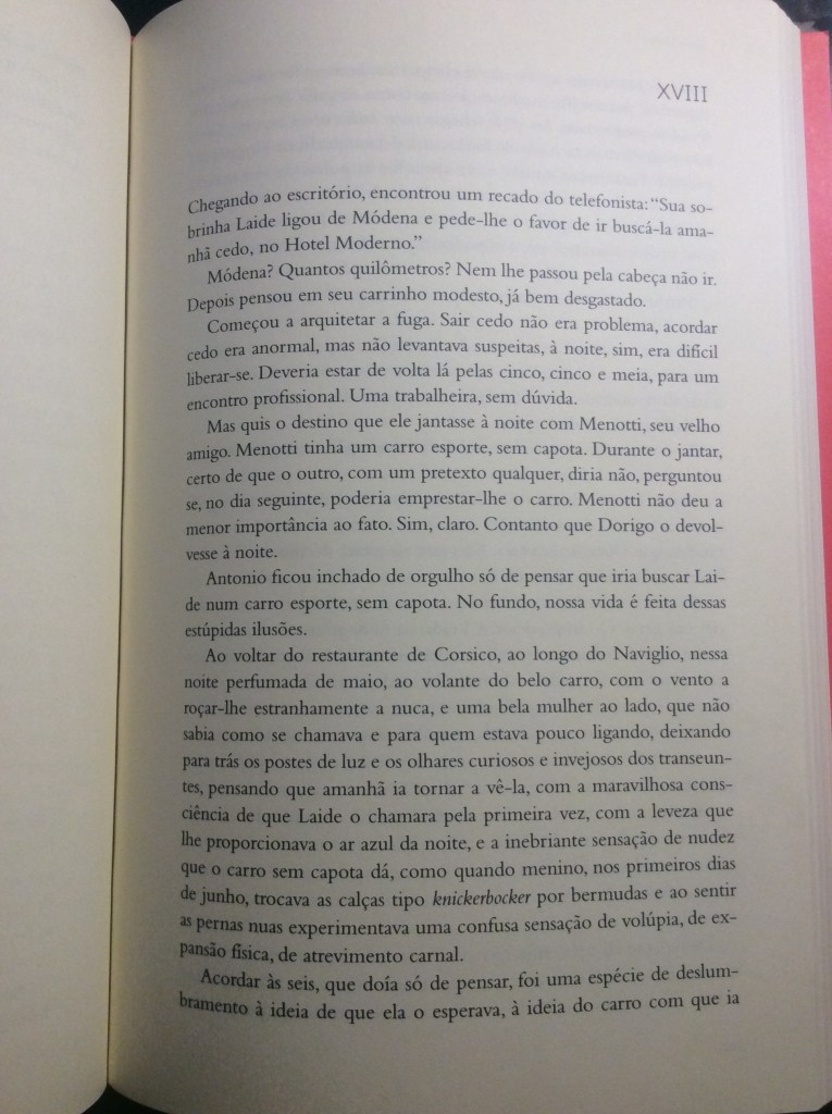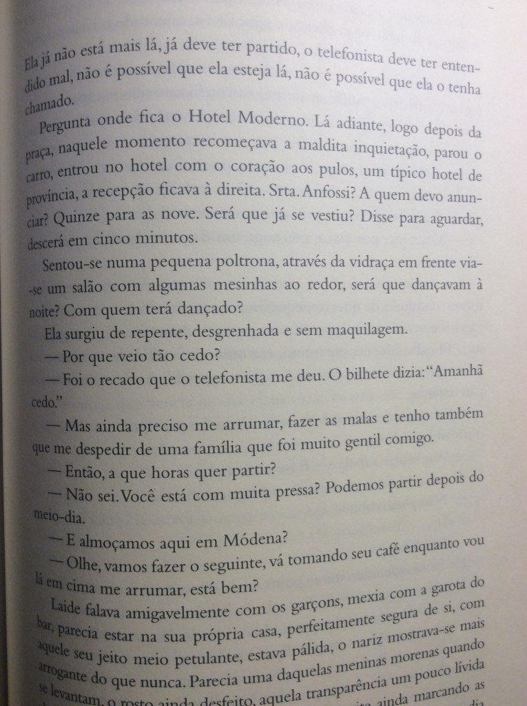 Narrado na terceira pessoa, em um discurso ora onipresente ora indireto livre, o romance nos mostra a derrocada de um homem seguro de si, arruinado pela visão romantizada de uma mulher que idealiza. Rimos dele, mas também choramos por Antonio, tão cego de amor que não percebe como está sendo descaradamente enganado por Laide. Aqui vai um trecho em que ele acredita que vai finalmente conquistá-la.