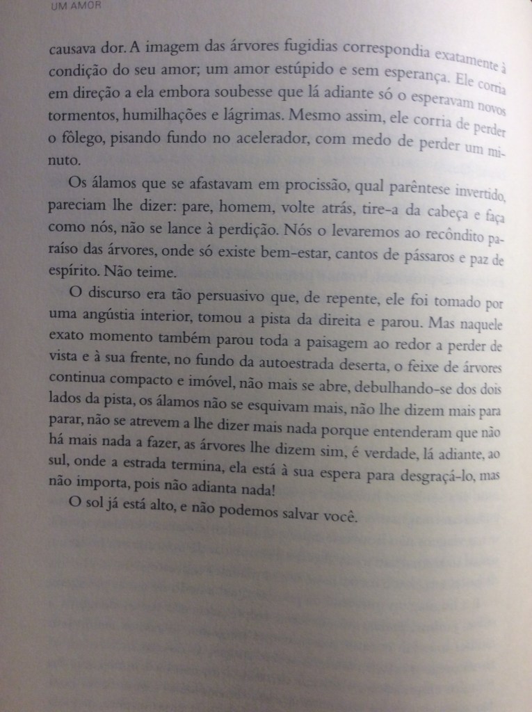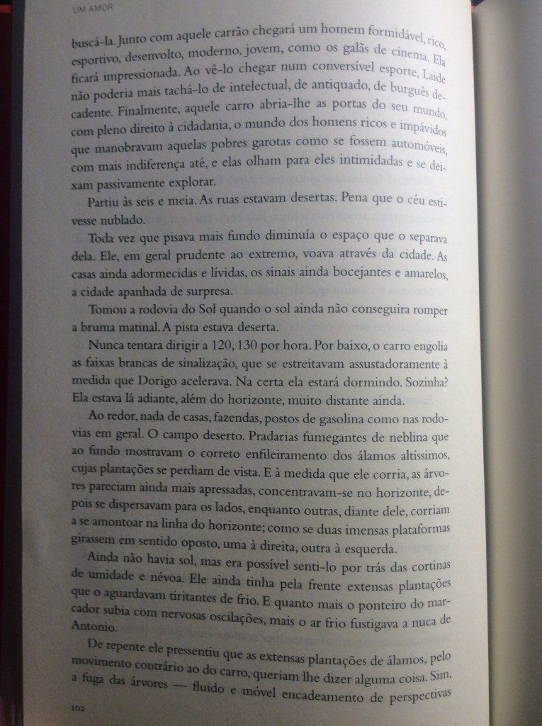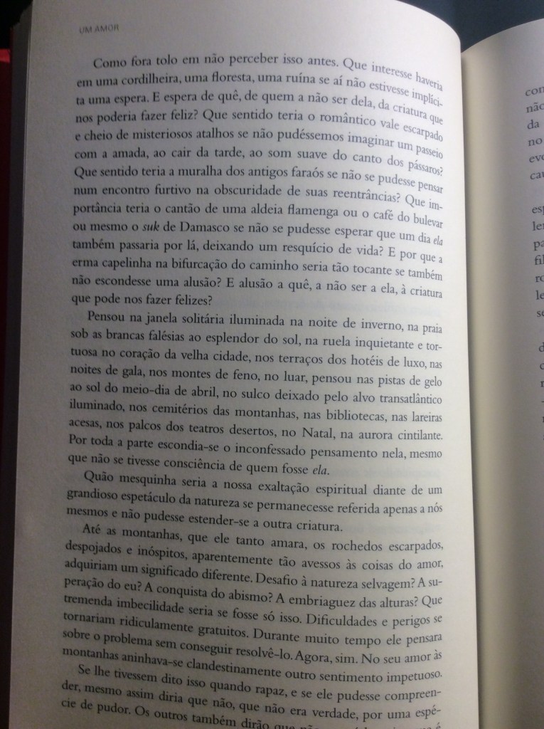 É em um romance de sua maturidade que fica mais evidente essa aproximação entre a atmosfera onírica e o comentário social, em um tom sempre compassivo e bem-humorado: Um Amor. Nele, um arquiteto cinquentão, que nunca se casou e satisfaz sua vida vazia saindo com garotas de programa, fica perdidamente apaixonado por uma jovem prostituta.