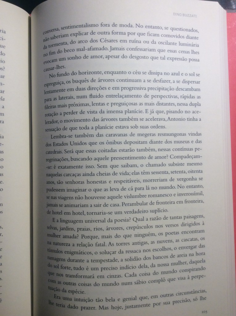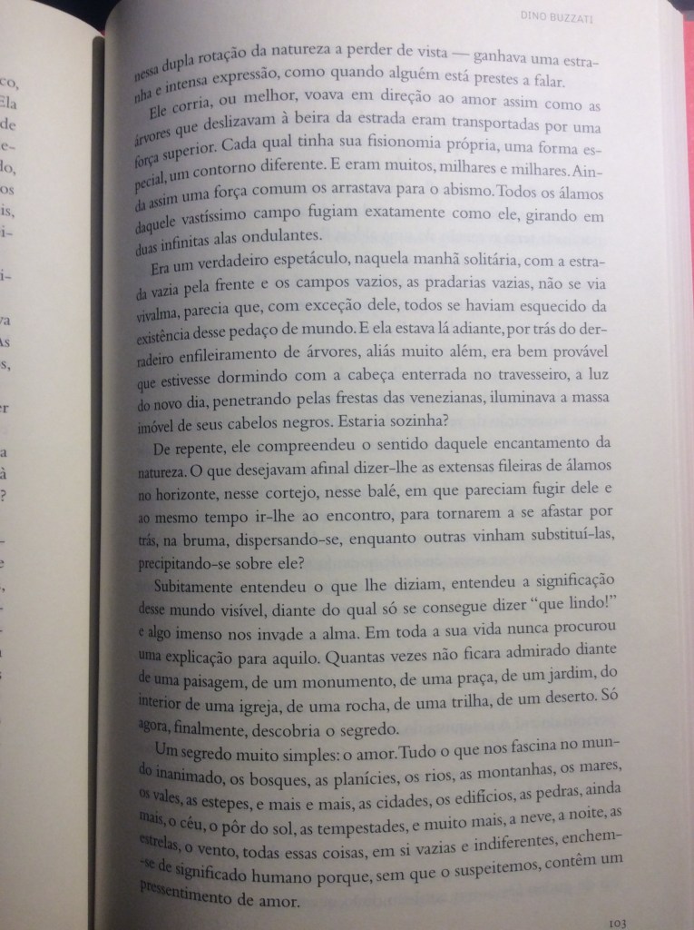 Uma chave para sua narração é a descrição detalhada do universo exterior. Como neste capítulo do romance de Buzzati, a paisagem externa tanto evoca quanto convoca a subjetividade do personagem apaixonado. As árvores sinalizam que Antonio está imerso no amor. Mas também o advertem que este amor pode ser perigoso, arriscado, equivocado.