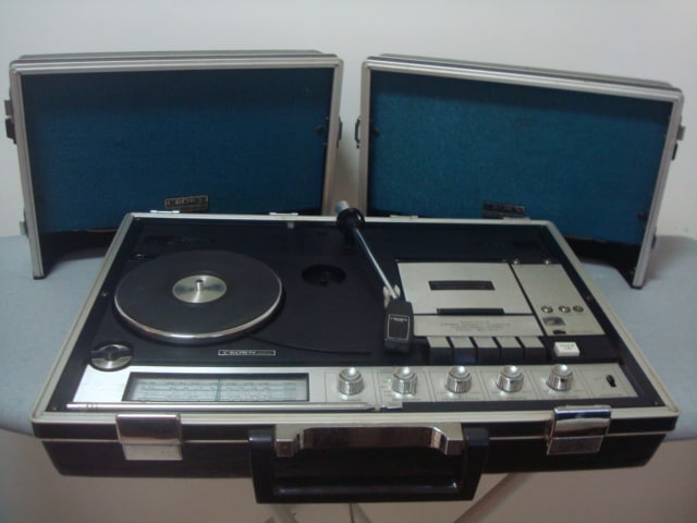 Aí eu viajei até a primeira metade dos anos 1970. Meus pais tinham ido ao México e trouxeram um system, tipo “três em um”, da Crown, muito peculiar. Era no formato de maleta 007, só que mais grossa. Metade da mala se dividia em duas caixas de som, com forro em azul claro. Na outra metade, toca-discos, toca-fitas e rádio, além de dois microfones. Eu e meu irmão André herdamos a maleta quando meu pai comprou equipamento mais moderno pra ele. Foi na maleta que me iniciei no rock.