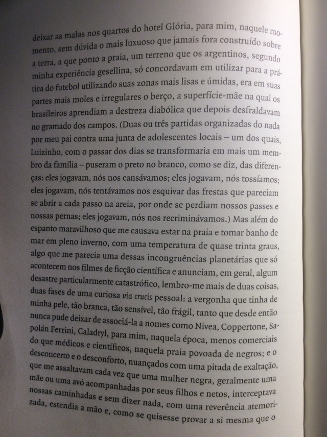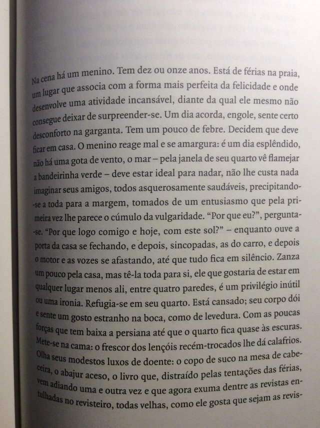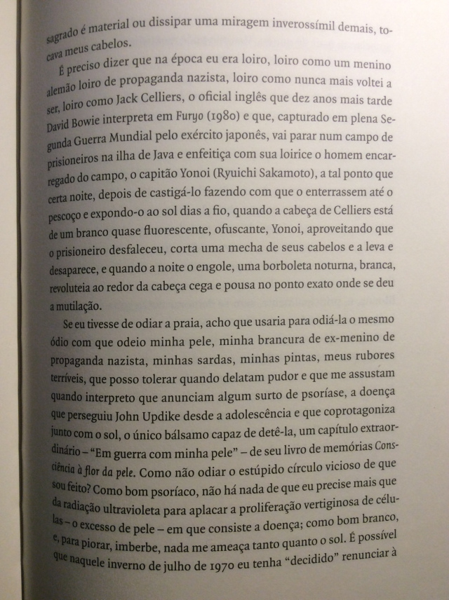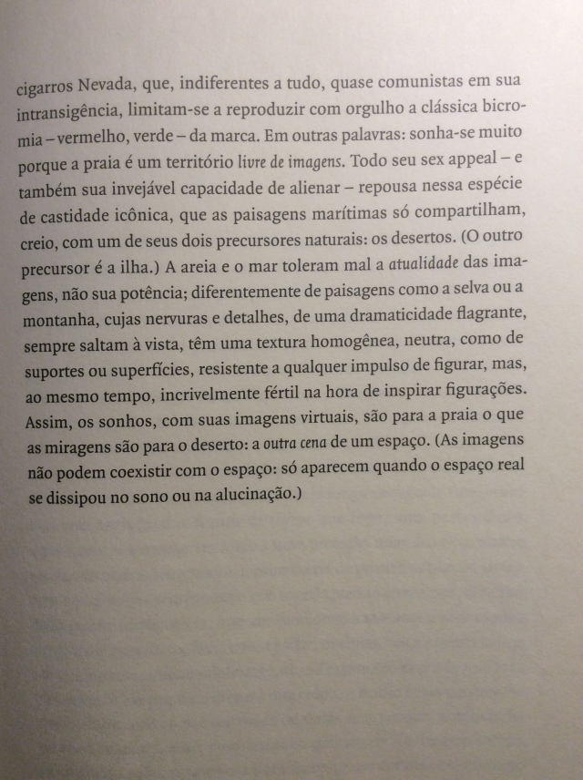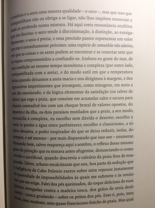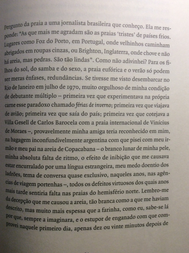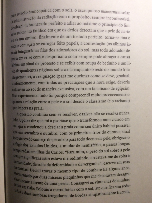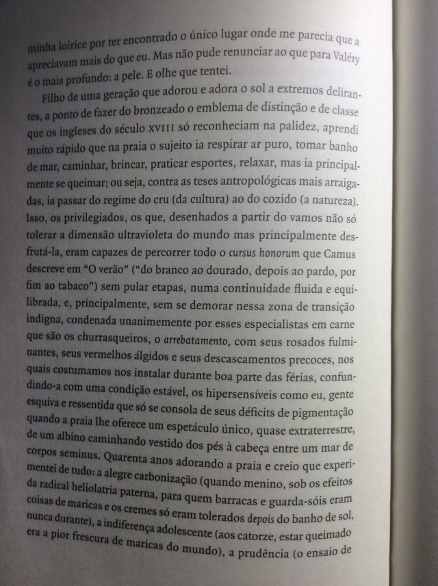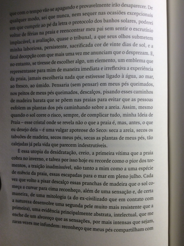 Uma das características do texto de Pauls é o alargamento do instante: a investigação não só do que acontece mas como acontece e por que acontece, explorando o evento em detalhes mínimos (daí as frases longas e períodos cheios de frases concatenadas). Enquanto revisita as praias da infância e da juventude, também pensa sobre o que é estar na praia – especialmente para uma pessoa que, por ter a pele muito branca, não se dava bem com o sol. Pauls se sente sempre inadequado na praia, e a praia o motiva a pensar. Aqui vão 3 excertos desse livrinho que é uma beleza.