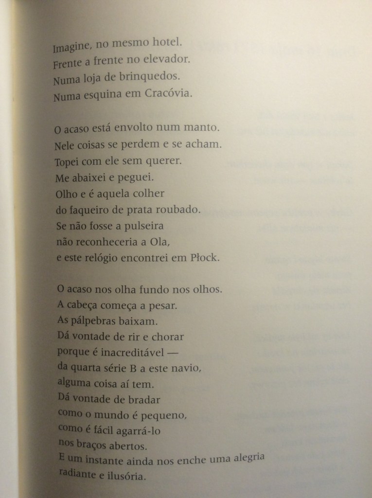 Szymborska é a grande poeta da dúvida – e por isso tem sido tão comparada a Drummond, por aqui, em especial àquele Drummond de Claro Enigma. Por exemplo, ela não parece acreditar no destino, mas, por outro lado, não deixa claro que não acredita. Seus poemas são discursivos, investigativos, ensaísticos: ela costuma chegar a uma ideia, ao fim do poema, depois de um passeio por várias hipóteses – é quase matemática, neste sentido. Porém, seu discurso não se pauta, quase nunca, em abstrações. Seu léxico acessível embute ideias complexas. Sua poesia é substantiva, procura buscar na vida e em objetos animados ou inanimados, ou mesmo em personagens, parábolas, alegorias ou metáforas de estados mentais. Sua filosofia parte do concreto para chegar ao abstrato. É uma poesia que também flerta com a narrativa: muitos poemas seus são cenas (como o célebre “O terrorista, ele observa”, uma lição de suspense) ou perfis históricos (como o retrato de Hitler quando criança). E é por isso que estamos falando de uma poeta para escrever prosa.