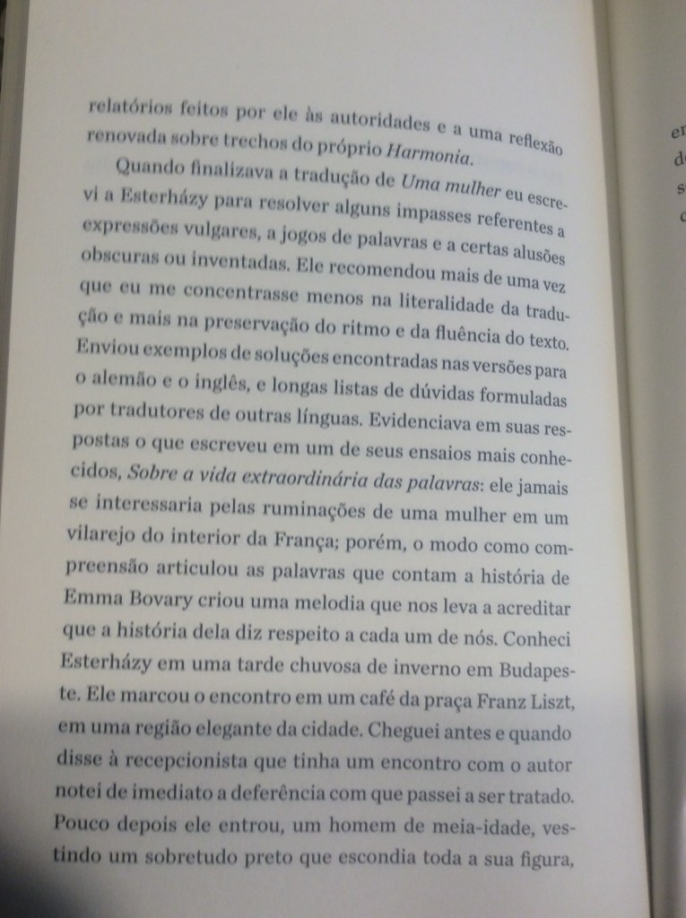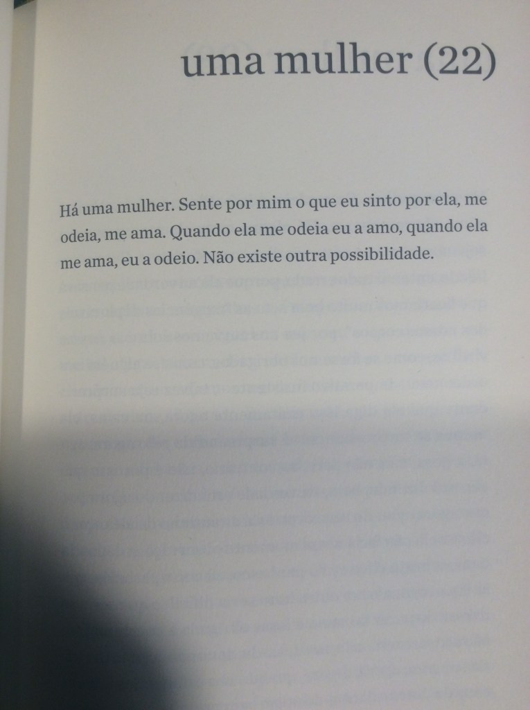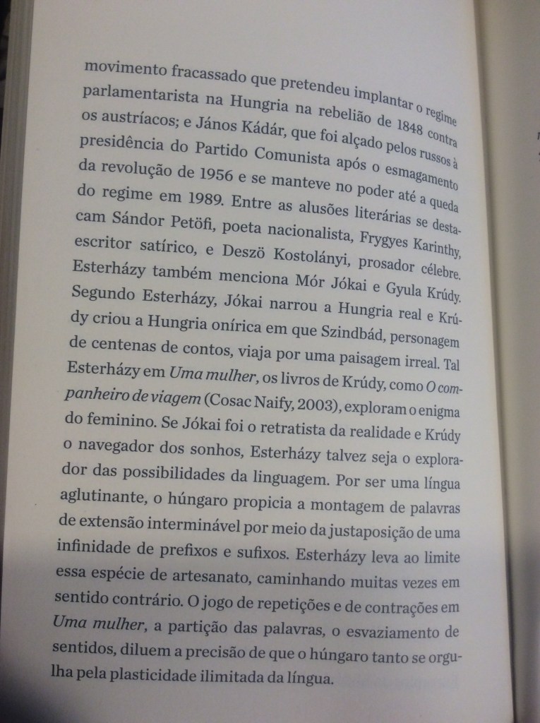 “Primeiro livro do celebrado escritor húngaro Péter Esterházy publicado no Brasil, Uma Mulher é composto de 97 historietas sobre relações amorosas. Quase todas começam com uma dessas fórmulas: ‘Há uma mulher. Ela me ama’, ou: ‘Há uma mulher. Ela me odeia’ — o que, o leitor logo percebe, vem a dar na mesma. Para o narrador deste mosaico de narrativas, o que interessa é estar nos extremos, como se apenas no amor e no ódio acontecesse aquilo que realmente importa.