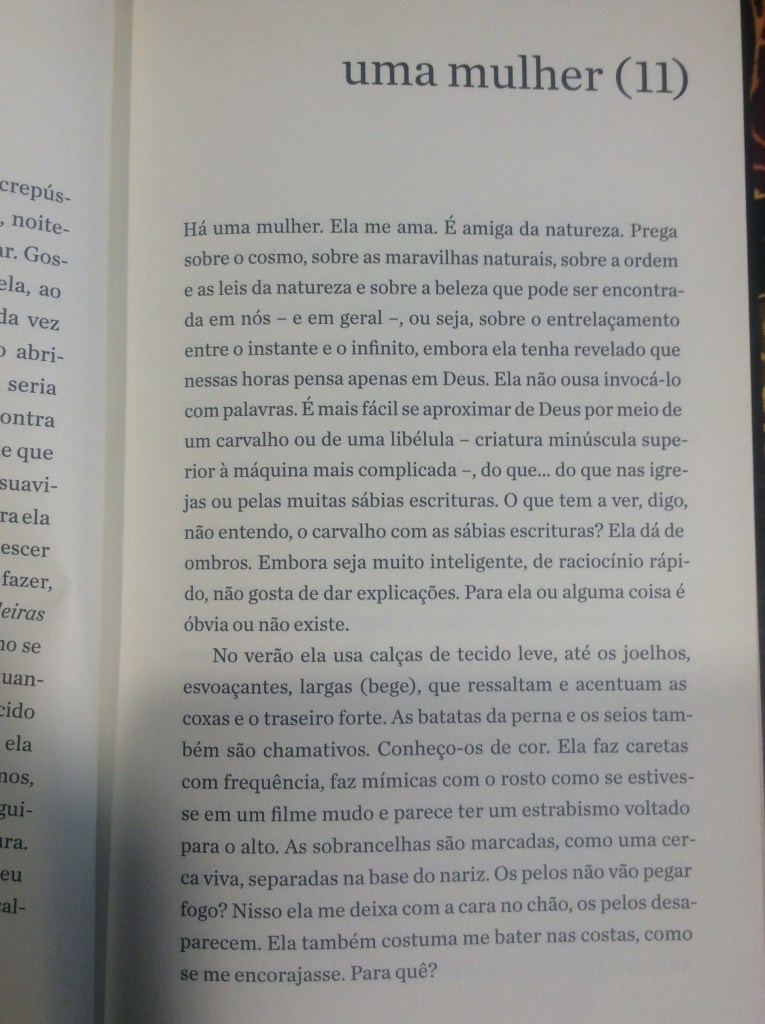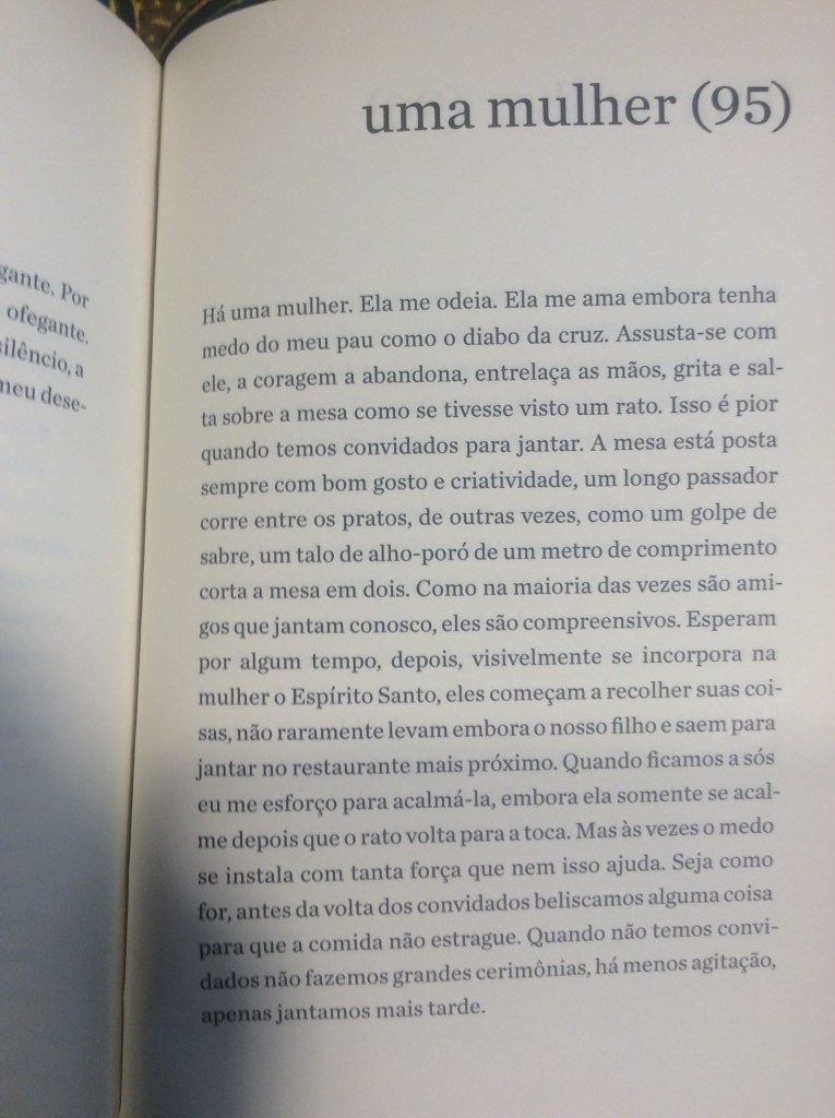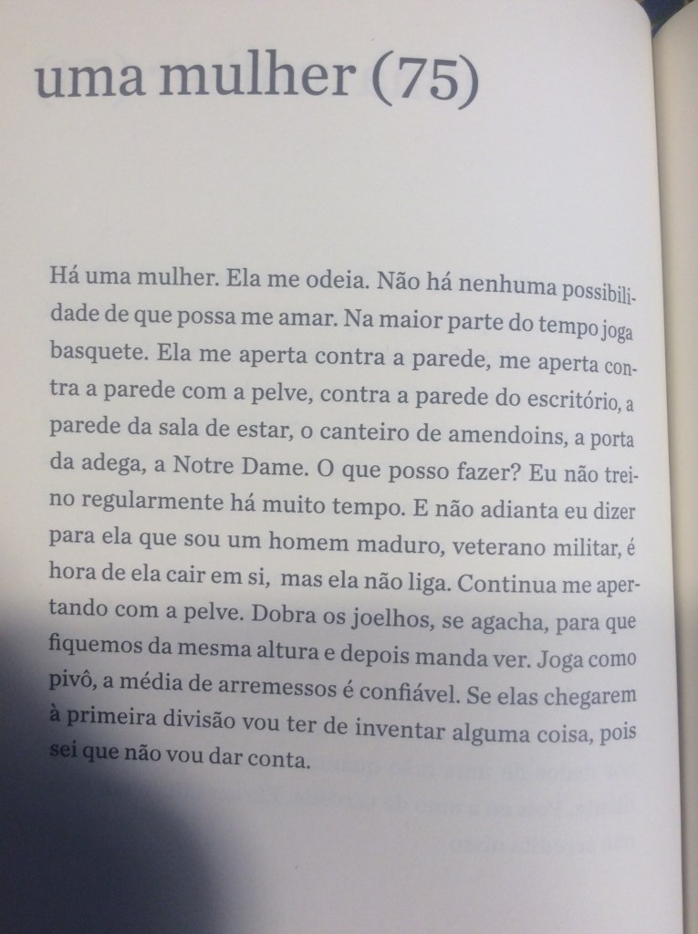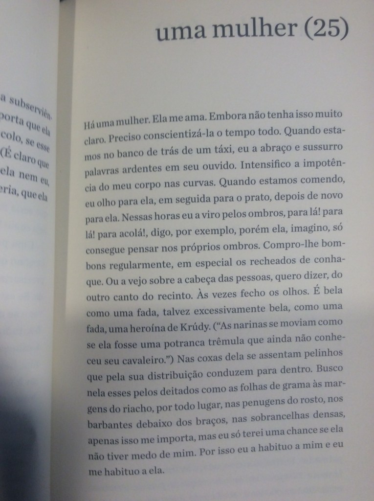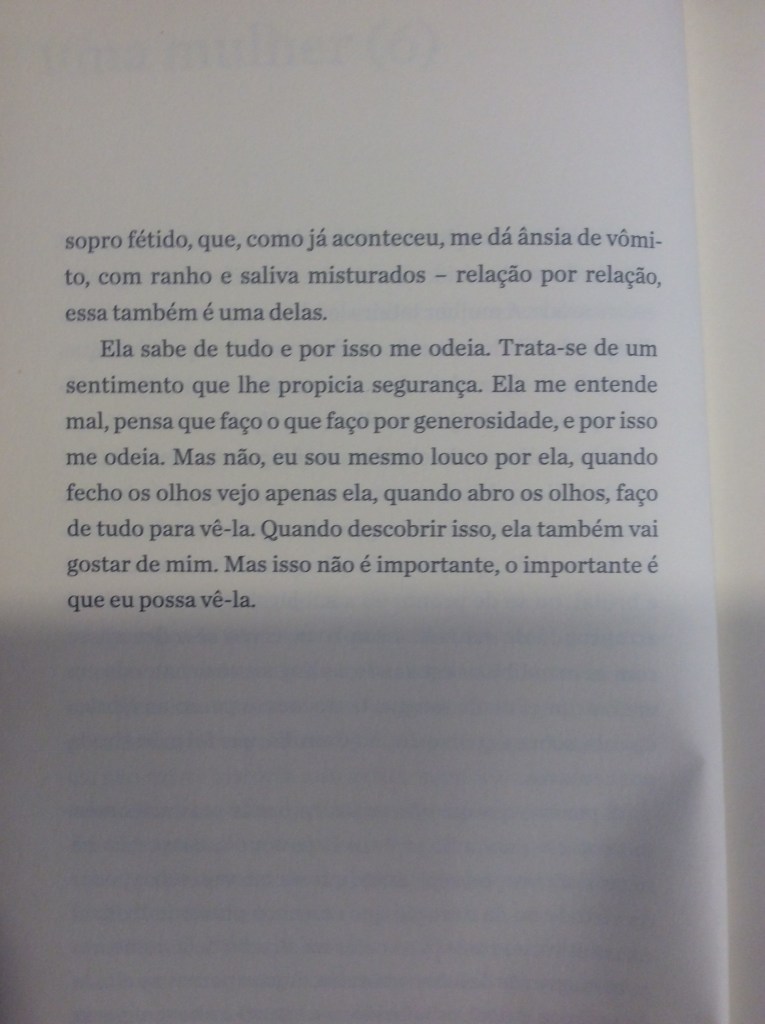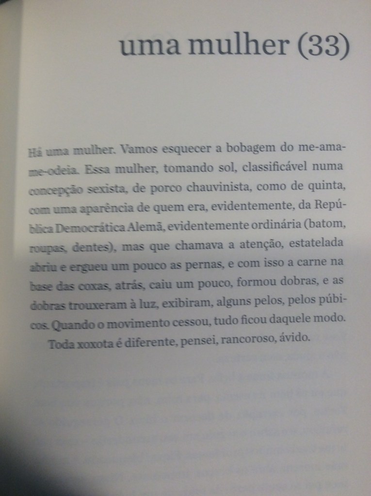 É com um humor refinado que o narrador passeia pela mulher obcecada em dietas, pela mulher que quer torná-lo vegetariano, pela mulher que quer casar e ter filhos, pela tarada, a misteriosa, a política, a banal. Aliás, não fosse o humor, o livro poderia se tornar por vezes enfadonho e repetitivo. Sorte do leitor o narrador conseguir nos levar a diferentes facetas dos sentimentos sem perder a graça. O ápice dessa habilidade talvez seja alcançado no trecho em que ele transforma essa mulher na própria mãe, que, ‘um dia, enquanto tomava sol estatelada, abriu e ergueu um pouco as pernas”: “Durante anos não consegui desviar o olhar. Não: nunca consegui desviar o olhar’.