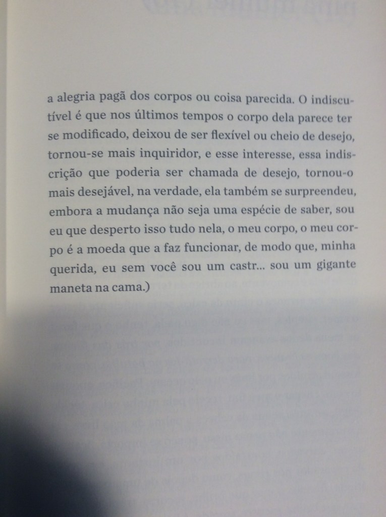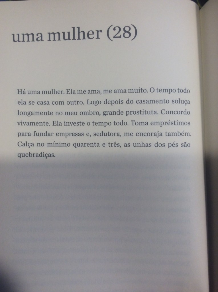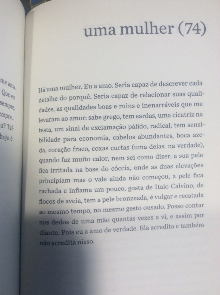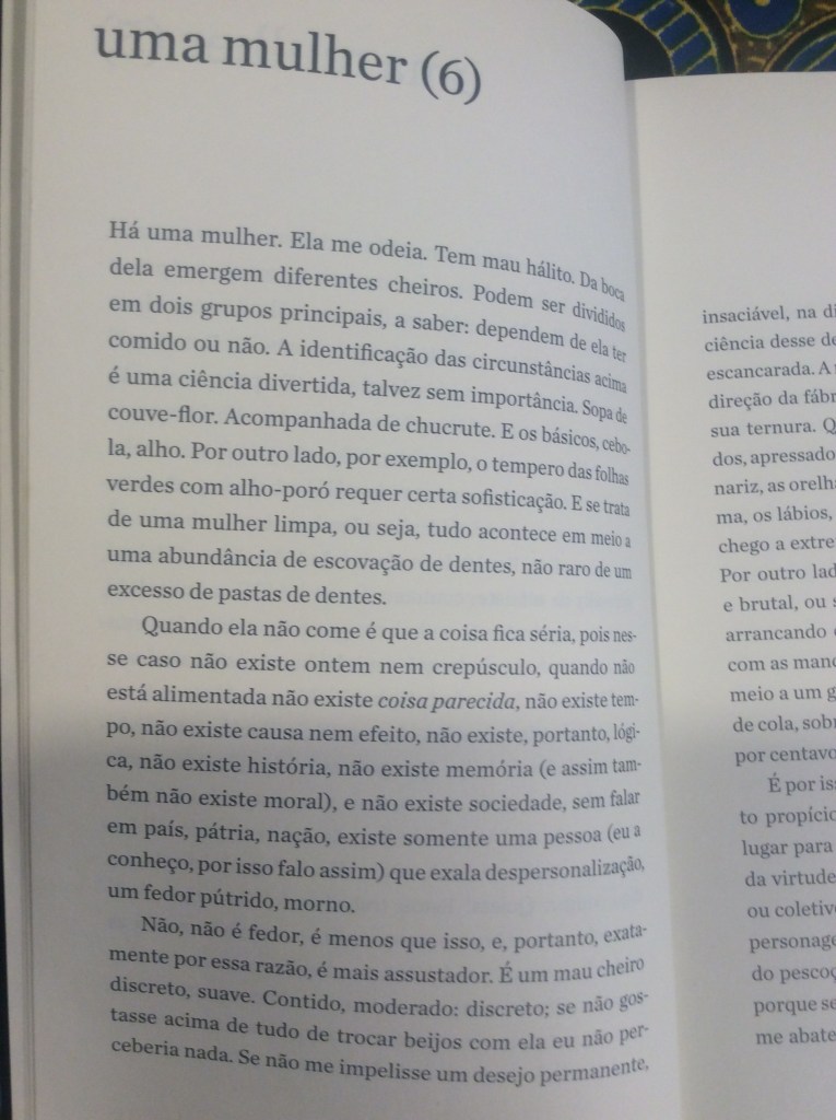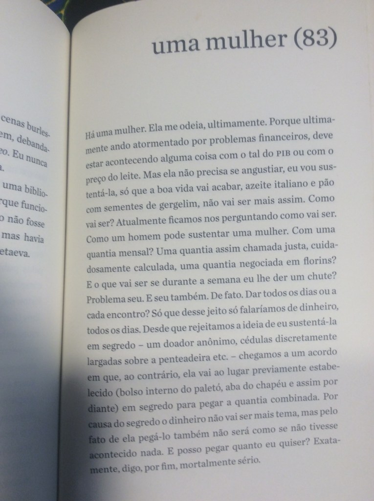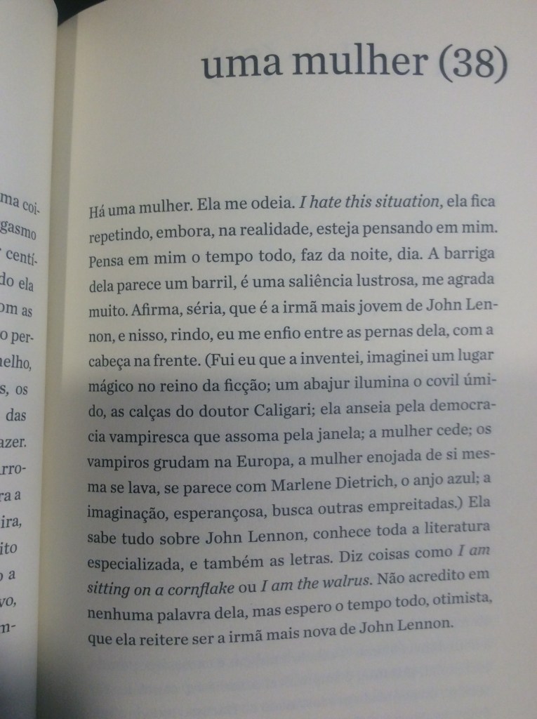 É com um humor refinado que o narrador passeia pela mulher obcecada em dietas, pela mulher que quer torná-lo vegetariano, pela mulher que quer casar e ter filhos, pela tarada, a misteriosa, a política, a banal. Aliás, não fosse o humor, o livro poderia se tornar por vezes enfadonho e repetitivo. Sorte do leitor o narrador conseguir nos levar a diferentes facetas dos sentimentos sem perder a graça. O ápice dessa habilidade talvez seja alcançado no trecho em que ele transforma essa mulher na própria mãe, que, ‘um dia, enquanto tomava sol estatelada, abriu e ergueu um pouco as pernas”: “Durante anos não consegui desviar o olhar. Não: nunca consegui desviar o olhar’.