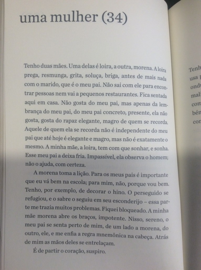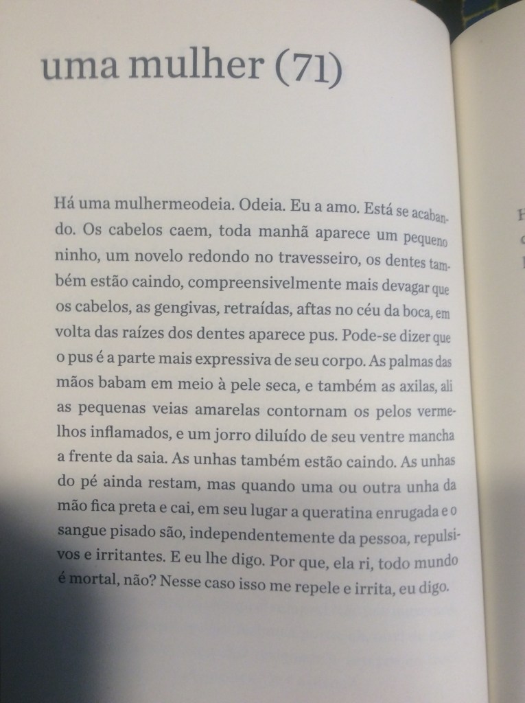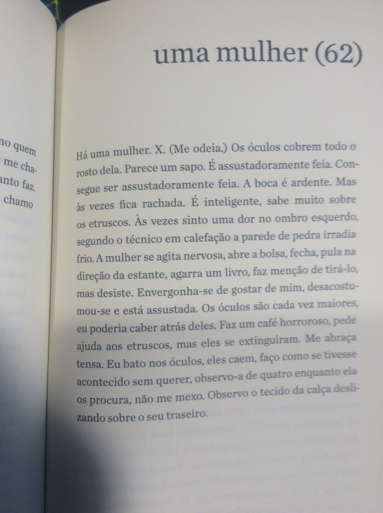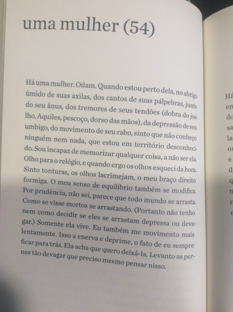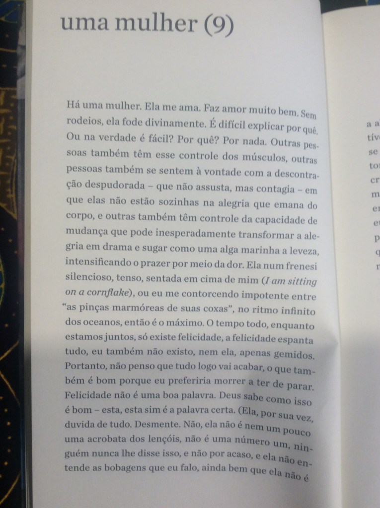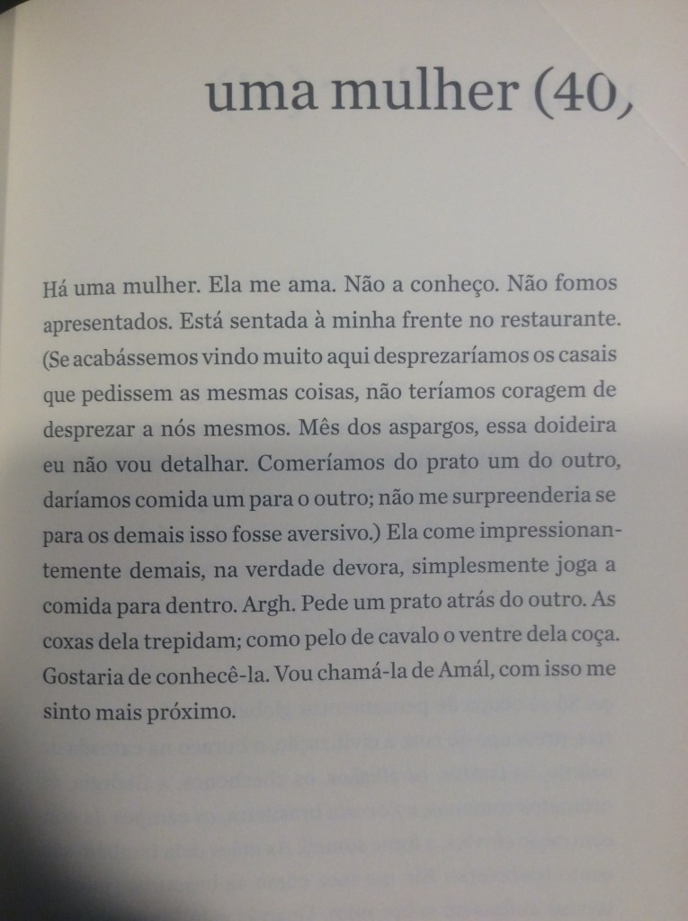 É com um humor refinado que o narrador passeia pela mulher obcecada em dietas, pela mulher que quer torná-lo vegetariano, pela mulher que quer casar e ter filhos, pela tarada, a misteriosa, a política, a banal. Aliás, não fosse o humor, o livro poderia se tornar por vezes enfadonho e repetitivo. Sorte do leitor o narrador conseguir nos levar a diferentes facetas dos sentimentos sem perder a graça. O ápice dessa habilidade talvez seja alcançado no trecho em que ele transforma essa mulher na própria mãe, que, ‘um dia, enquanto tomava sol estatelada, abriu e ergueu um pouco as pernas”: “Durante anos não consegui desviar o olhar. Não: nunca consegui desviar o olhar’.