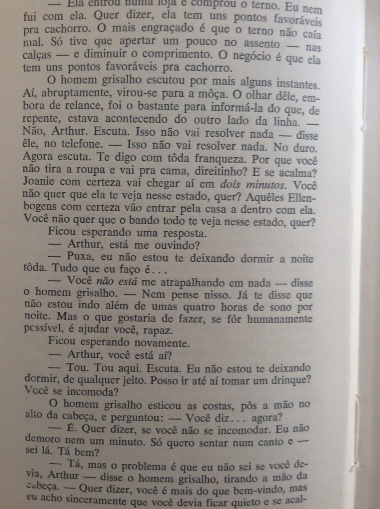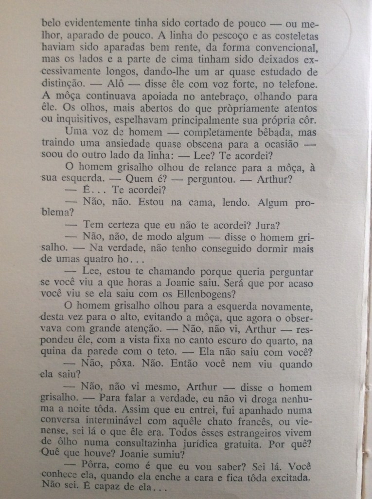 O homem grisalho, pivô do texto, é um quase anônimo Lee. O sujeito que liga para ele se chama Arthur. Lee está acompanhado de uma moça, e, pelo contexto, percebemos que estão em um quarto, em uma cama, está meio escuro, então devem ter acabado de transar. Arthur pergunta a Lee se ele viu que horas sua mulher, Joanie, sair da festa – deduzimos que Lee também estava na festa. Salinger nunca nomeia a moça que está com o grisalho, mas percebemos, ao longo do diálogo, ser Joanie. Percebemos ainda que Arthur e Lee são muito amigos.