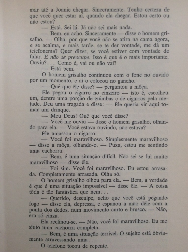 O conto é quase todo estruturado em um longo diálogo, como muitas das histórias de Salinger. Impressiona que mesmo hoje, 2019, o texto mantenha o frescor de quando foi escrito, no pós-guerra, nos anos 50. Descendente direto do minimalismo de Hemingway, ele contém um ou mais histórias ocultas. Usa somente o indispensável.