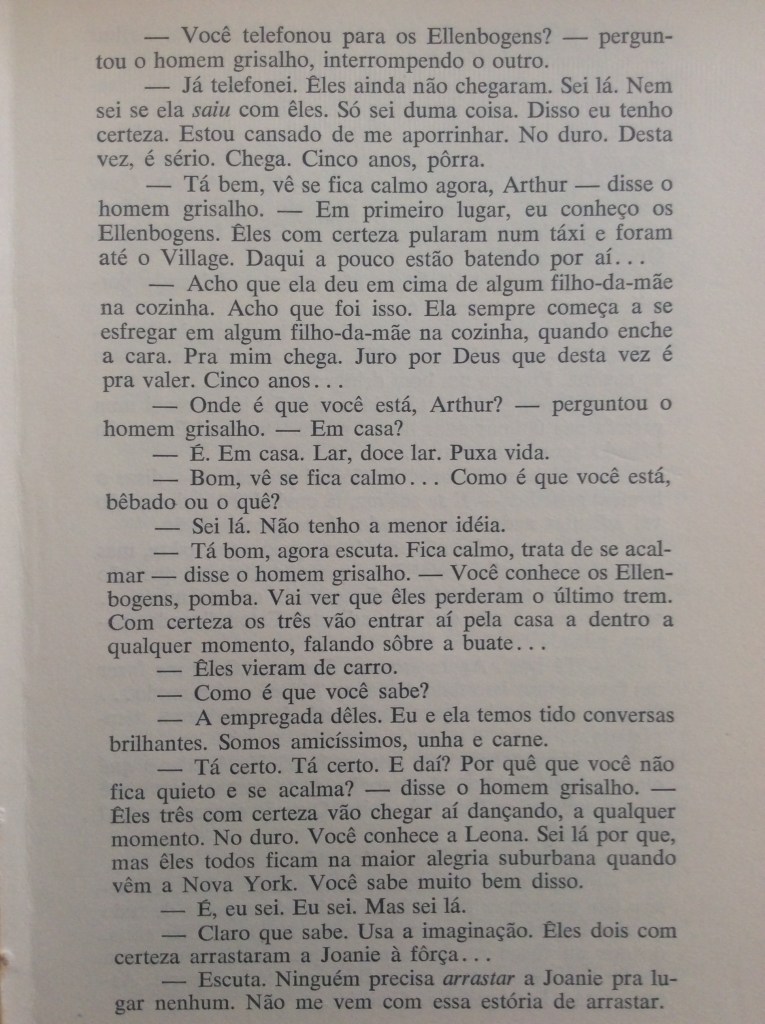 Ou seja, estamos vendo uma clássica história de traição. Mas ela é toda baseada em omissões, mentiras e suposições. O grisalho consola e aconselha o amigo a quem acabou de trair. O amigo corno na verdade não gosta da moça, e a critica o tempo todo. Por fim, o amigo liga para o grisalho para dizer que a moça chegou em casa, o que é uma mentira – mas é um jeito de ele não se rebaixar perante ao amigo, sem saber que o amigo no fundo o está corneando. Ou será que adivinhou? Nunca saberemos.