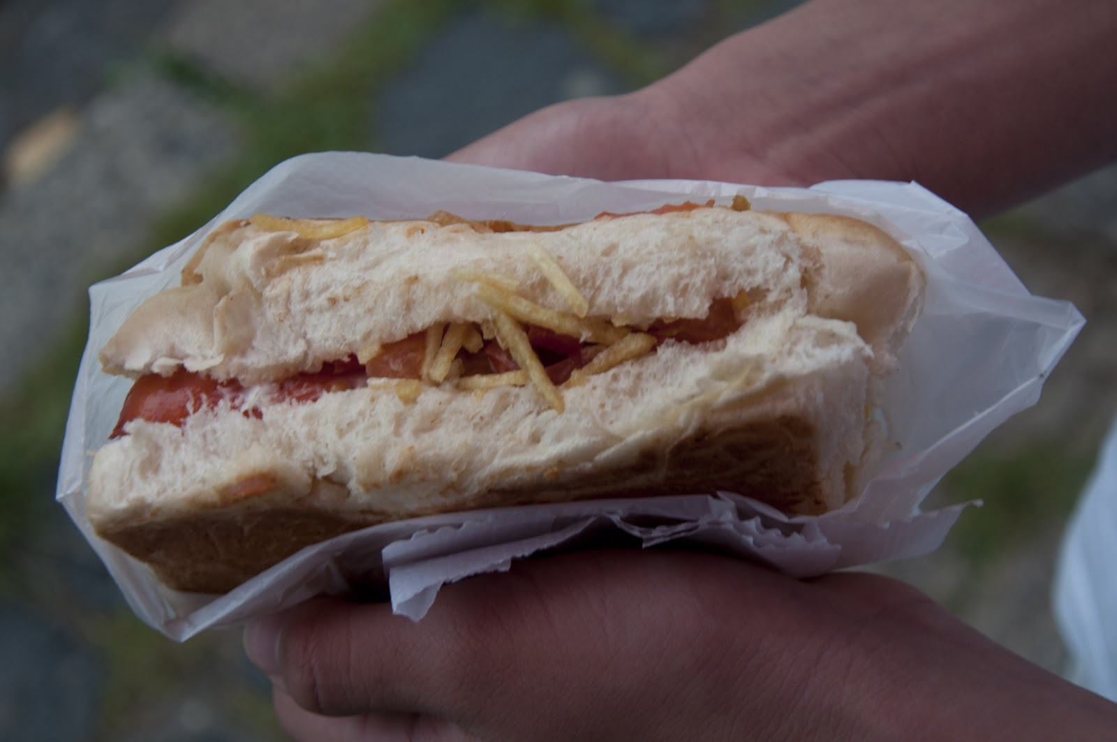 Apontou pro cachorro-quente na estufa. Ficamos sabendo que vina era o mesmo que salsicha. Gasosa, ele explicou, era refrigerante.