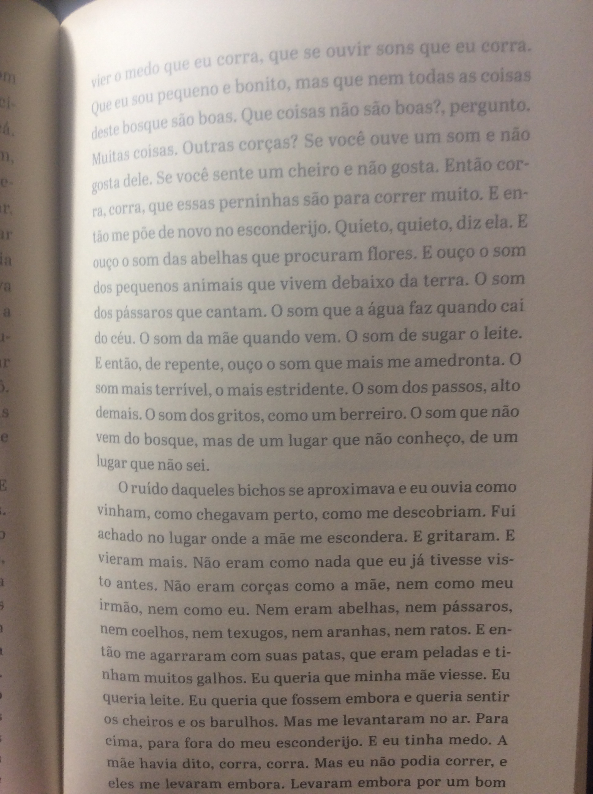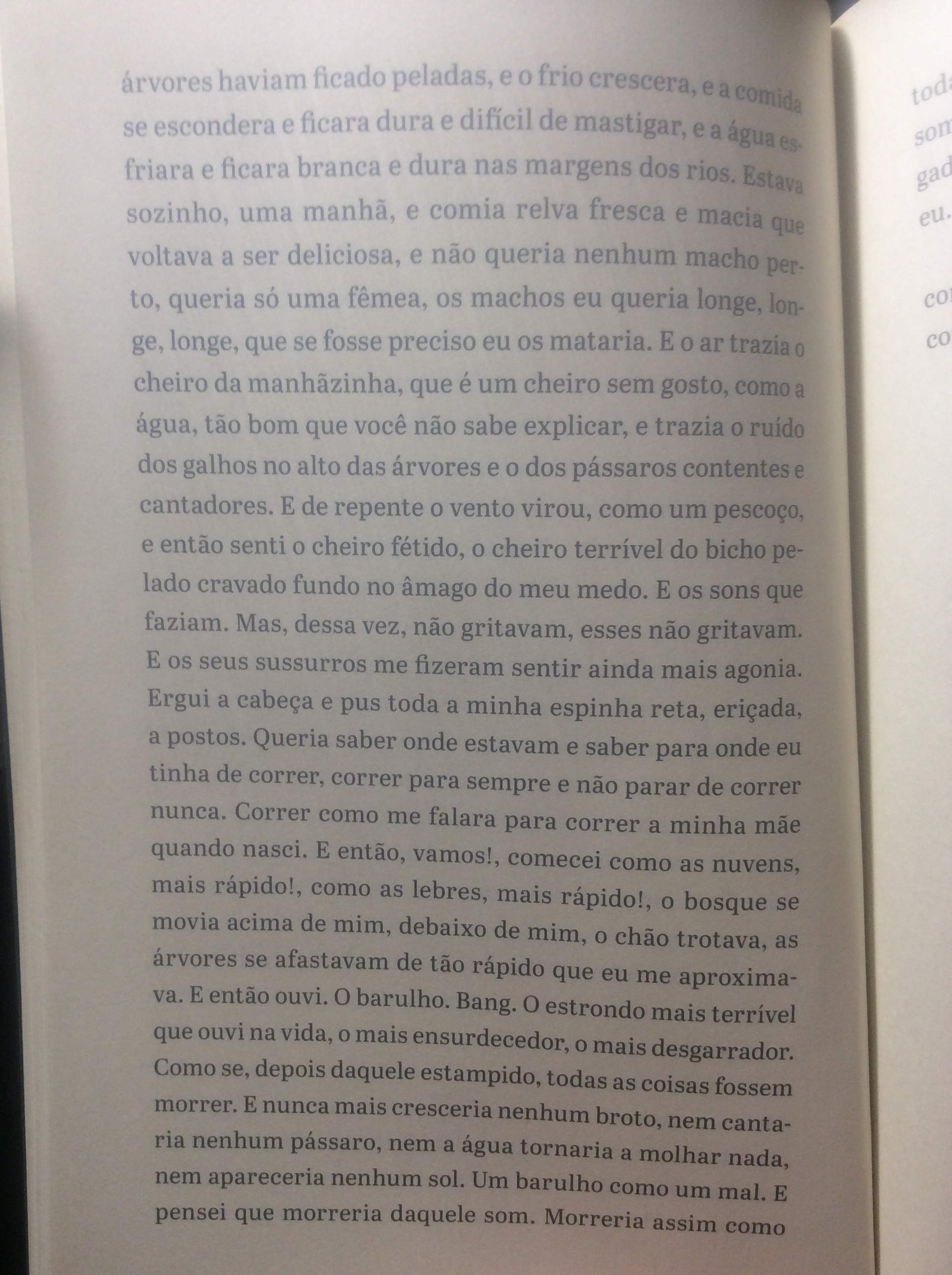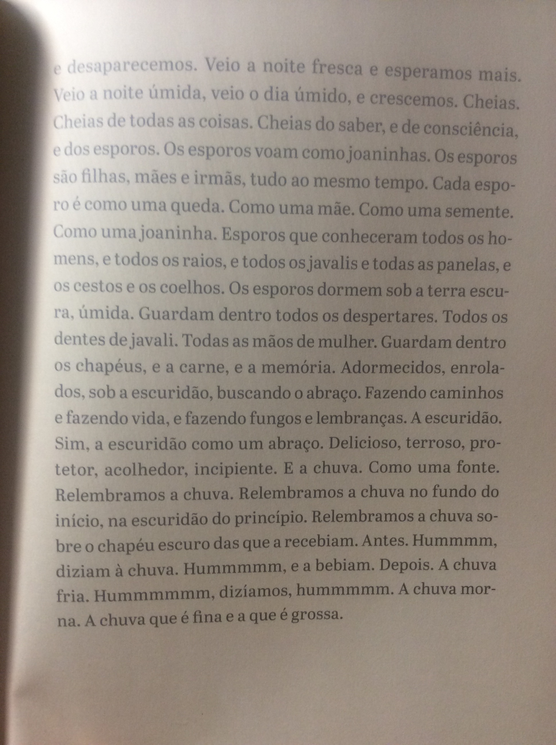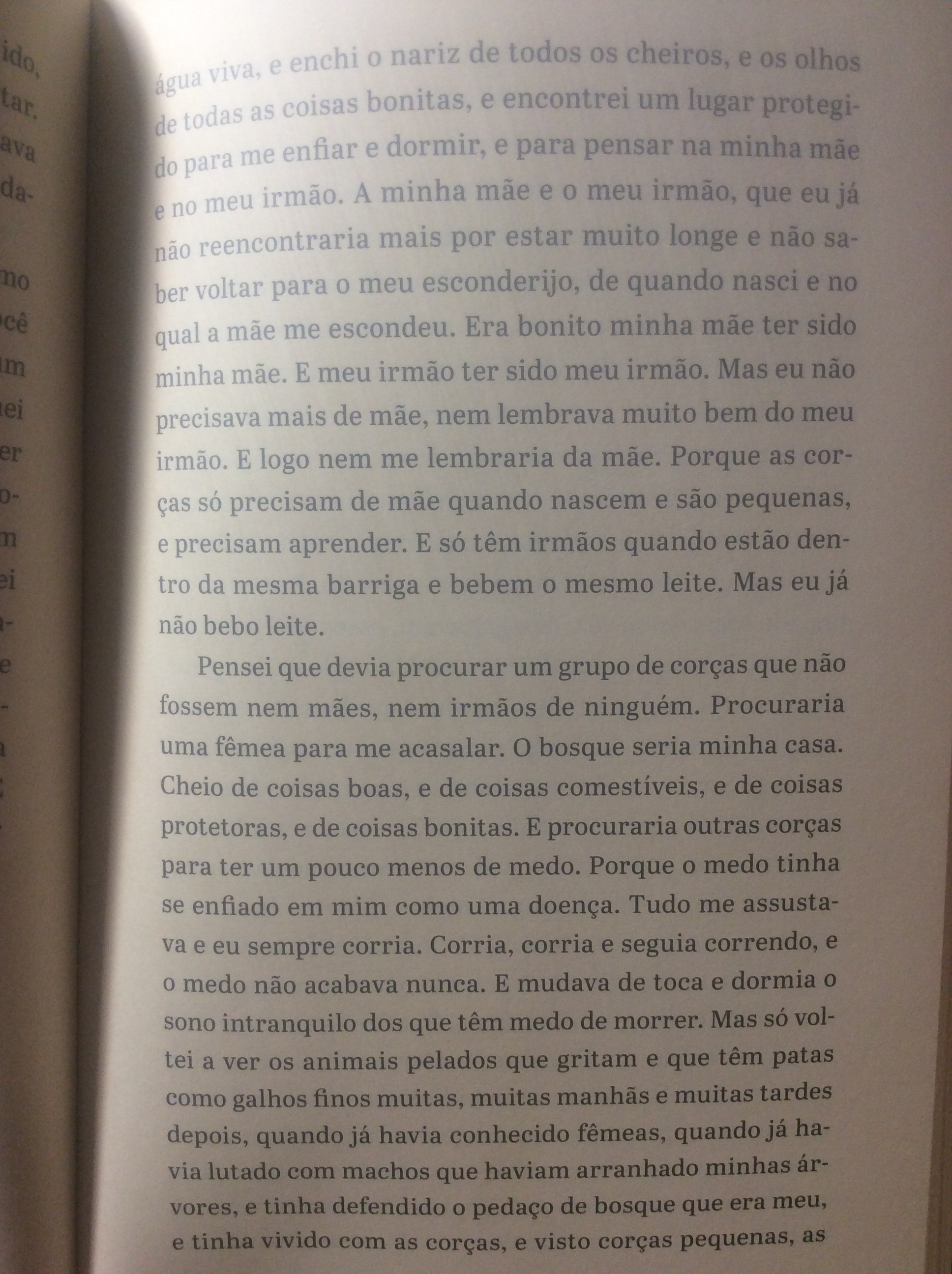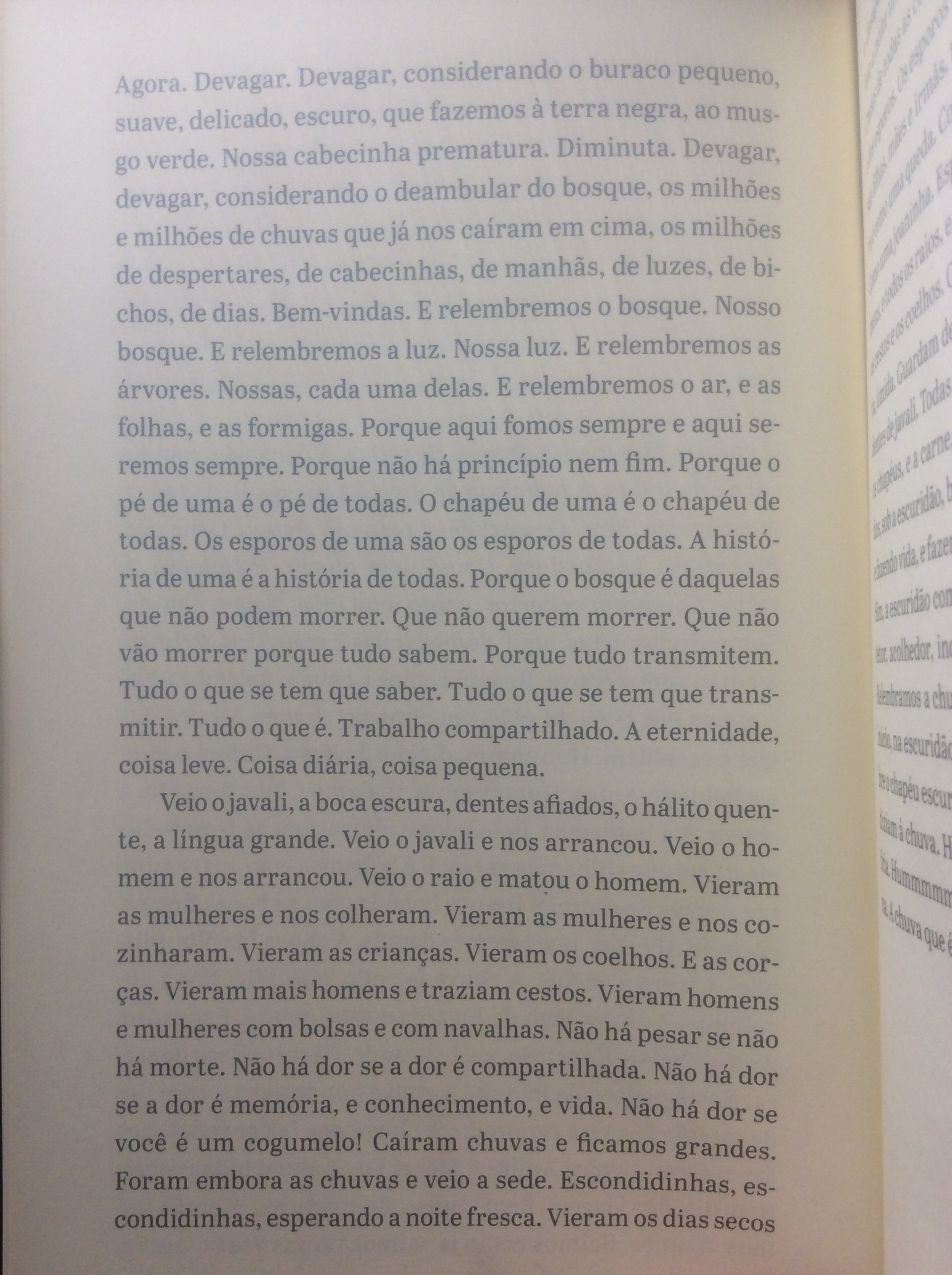 Aqui vão três trechos: um narrado por uma colônia de fungos, outro por uma corça e outro por uma cadela.