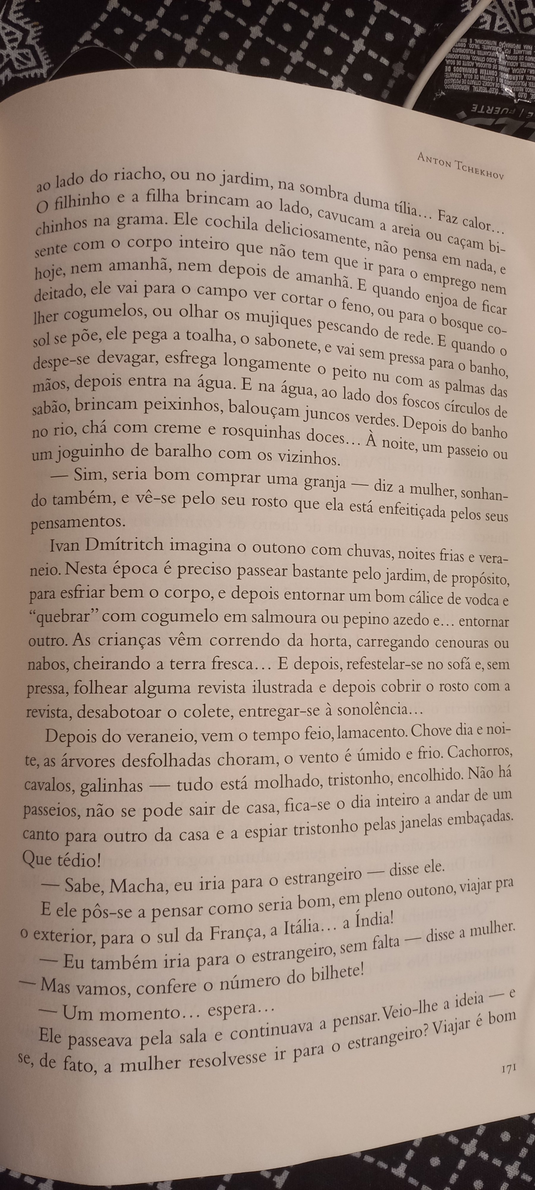 Uma hora teríamos de ler Anton Tchecov, o Drauzio Varela deles, um dos maiores contistas que existiram. Médico e humanista, o russo-ucraniano viveu só 44 anos até morrer de tuberculose. Antes disso, inscreveu seu nome na literatura através de um modo muito particular de atacar os conflitos – sem ênfase, pautado nos subtextos, nas pausas e nos silêncios. Era um antiépico, e seu interesse sociológico se dava pela observação fina dos comportamentos psicológicos de seus personagens. Uma escrita em tom menor, sem pressa, convergindo para finais abertos. Teve grande influência sobre Joyce, Woolf, Hemingway e Carver. Ricardo Piglia define a estrutura de suas narrativas breves através do conceito das “duas histórias”, em que a história latente, em vez de resolver-se como uma história manifesta, mantém-se em estado de suspensão. Existe toda uma vertente da crítica literária que propõe Tchecov como o pai do conto contemporâneo. O conto abaixo é uma de suas narrativas mais famosas e está na edição Contos, da Nova Fronteira, traduzido por Tatiana Bilenky.