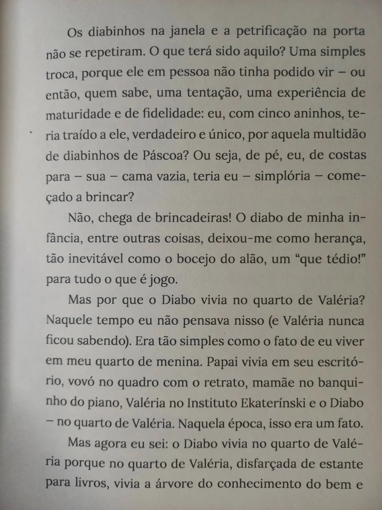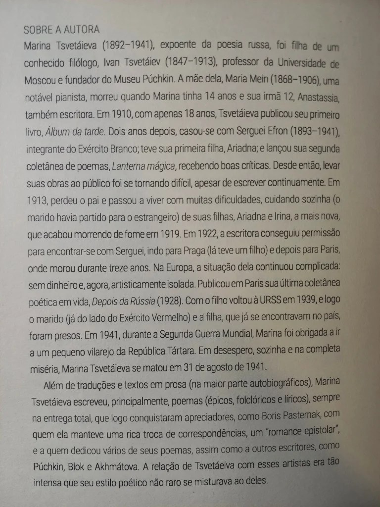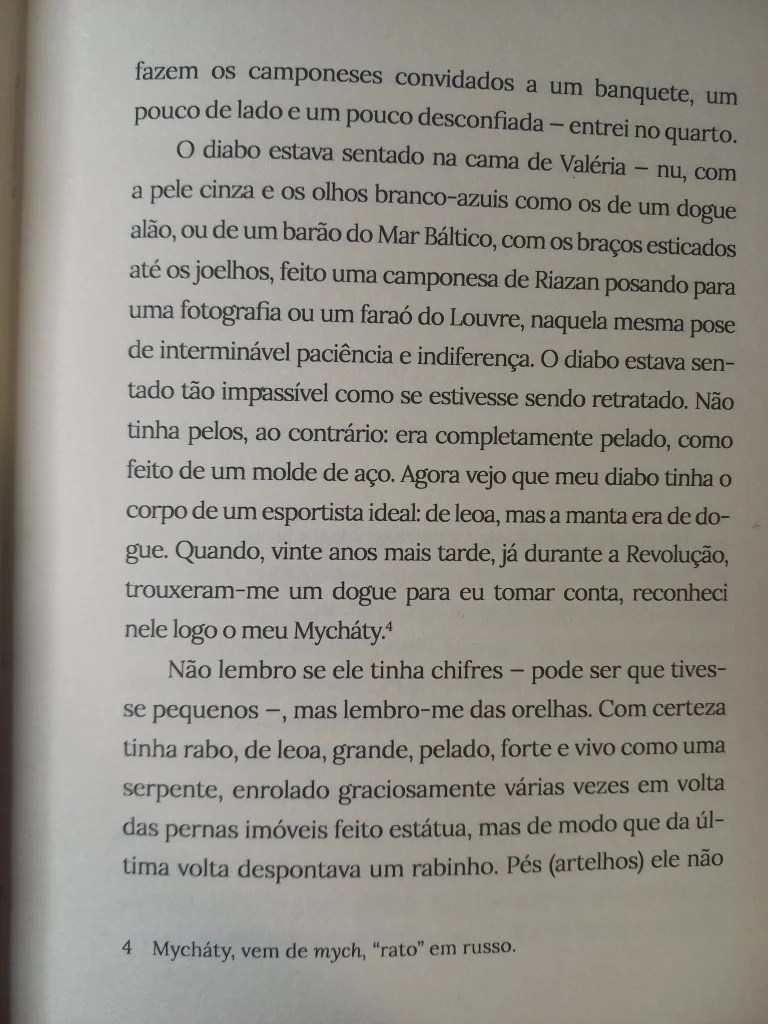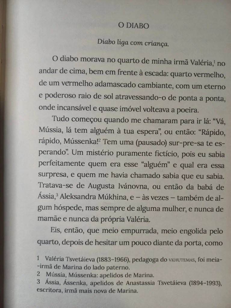 Marina Tsvetáieva foi uma das grandes poetas russas do começo do século 20, participante do círculo de Anna Akhmátova, Sofia Parnok e Óssip Mandelstam (aliás namorou os dois últimos), todos pertencentes à grande geração de Maiakóvski. Começou a publicar poesia antes dos 18 anos, escrevendo também incessantemente ensaios e prosa em seus escassos 49 anos. Moscovita, mesmo filha e irmã de artistas reconhecidos e importantes, foi perseguida pelo stalinismo e impedida de publicar. Exilou-se já em 1922, voltou à URSS em 1939 e suicidou-se em 1941. O livrinho abaixo é um de seus raros exemplares de ficção, baseada em um episódio autobiográfico: na infância, conta, hospedou em seu quarto um diabo. O livrinho traz as impressões ambíguas, sensuais, sensoriais, literárias e pluriculturais da figura do diabo para Tsvetáieva. O Mycháty é dual e paródico, um medo e um segredo. Não por acaso o texto tem a epígrafe “Diabo liga com criança”, expressão russa que denota atração de diferentes – daí a figura ser chamada ambiguamente Deus-Diabo. Sob um Estado ateu, o tipo de literatura que não pegava bem…