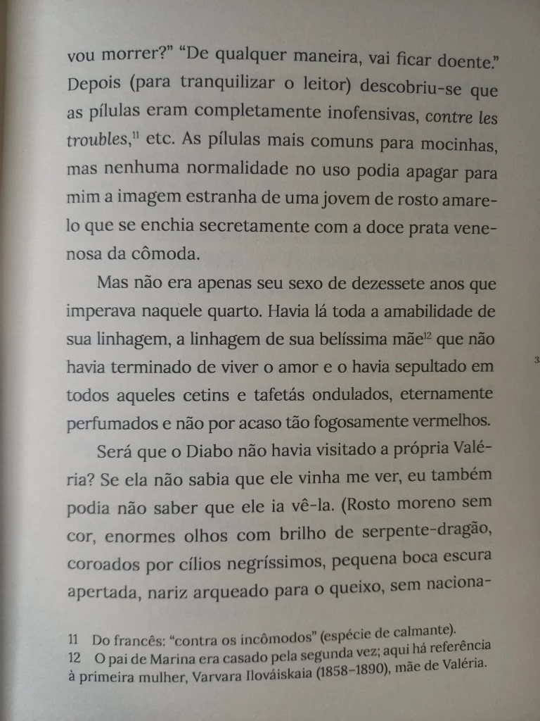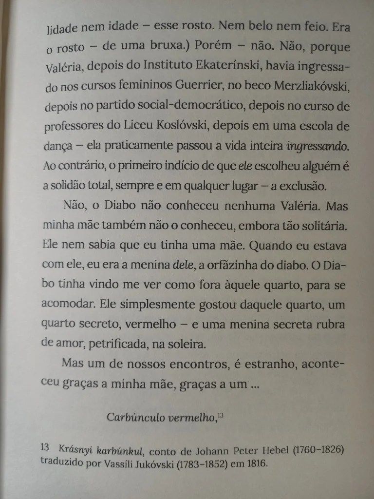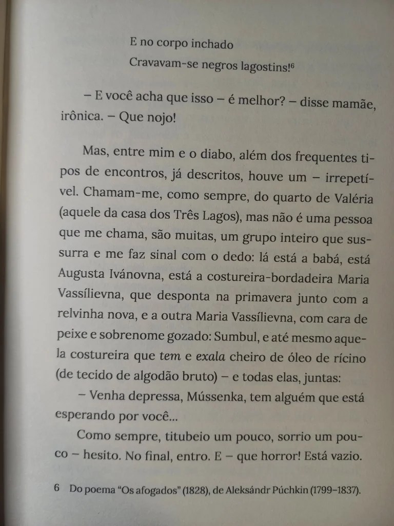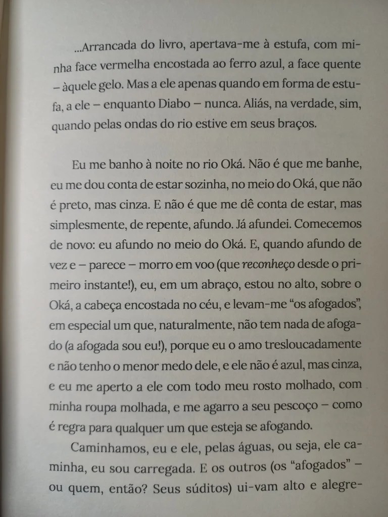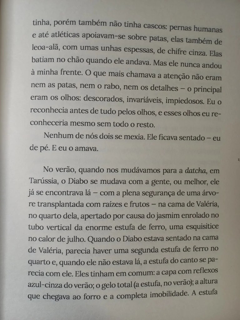 Marina Tsvetáieva foi uma das grandes poetas russas do começo do século 20, participante do círculo de Anna Akhmátova, Sofia Parnok e Óssip Mandelstam (aliás namorou os dois últimos), todos pertencentes à grande geração de Maiakóvski. Começou a publicar poesia antes dos 18 anos, escrevendo também incessantemente ensaios e prosa em seus escassos 49 anos. Moscovita, mesmo filha e irmã de artistas reconhecidos e importantes, foi perseguida pelo stalinismo e impedida de publicar. Exilou-se já em 1922, voltou à URSS em 1939 e suicidou-se em 1941. O livrinho abaixo é um de seus raros exemplares de ficção, baseada em um episódio autobiográfico: na infância, conta, hospedou em seu quarto um diabo. O livrinho traz as impressões ambíguas, sensuais, sensoriais, literárias e pluriculturais da figura do diabo para Tsvetáieva. O Mycháty é dual e paródico, um medo e um segredo. Não por acaso o texto tem a epígrafe “Diabo liga com criança”, expressão russa que denota atração de diferentes – daí a figura ser chamada ambiguamente Deus-Diabo. Sob um Estado ateu, o tipo de literatura que não pegava bem…