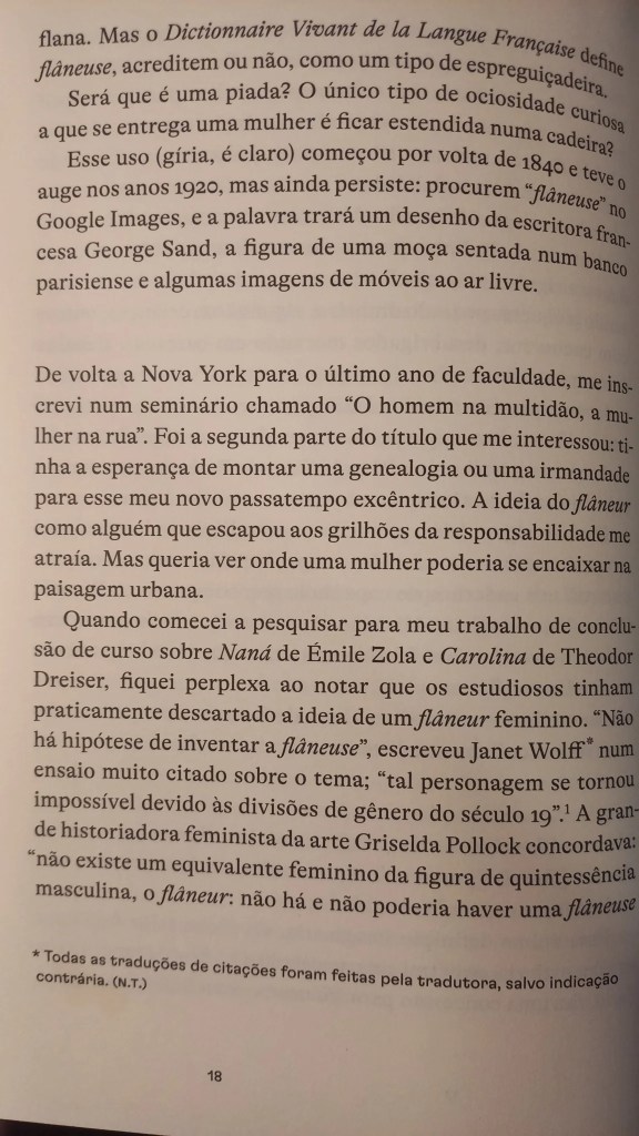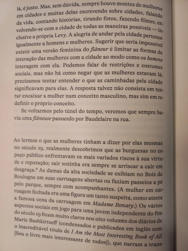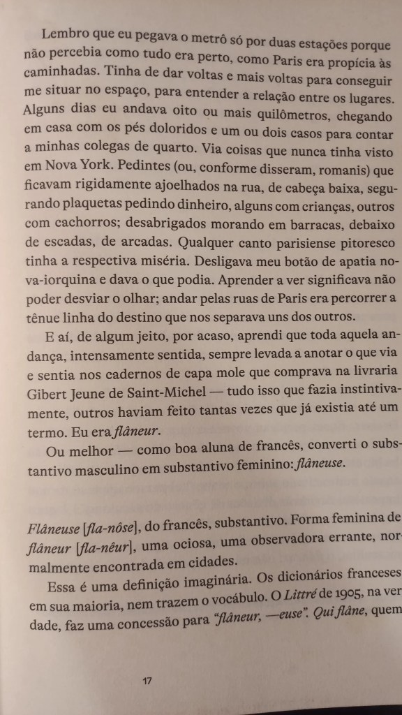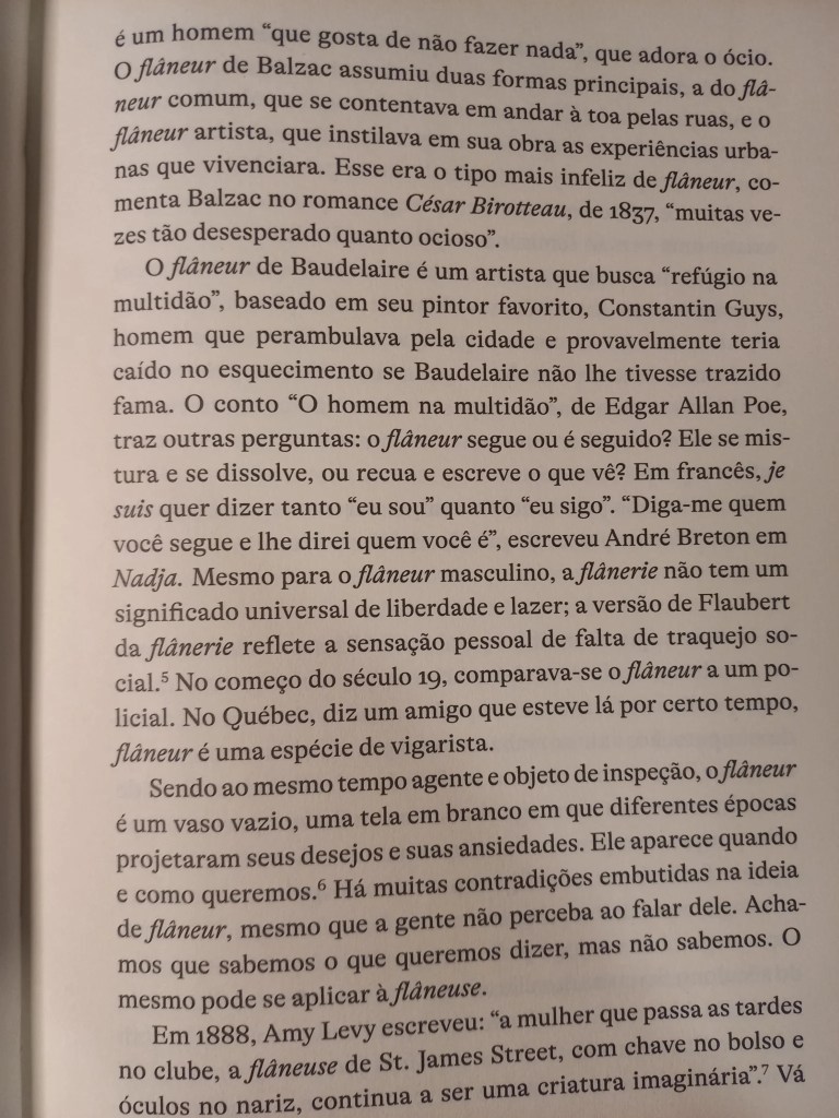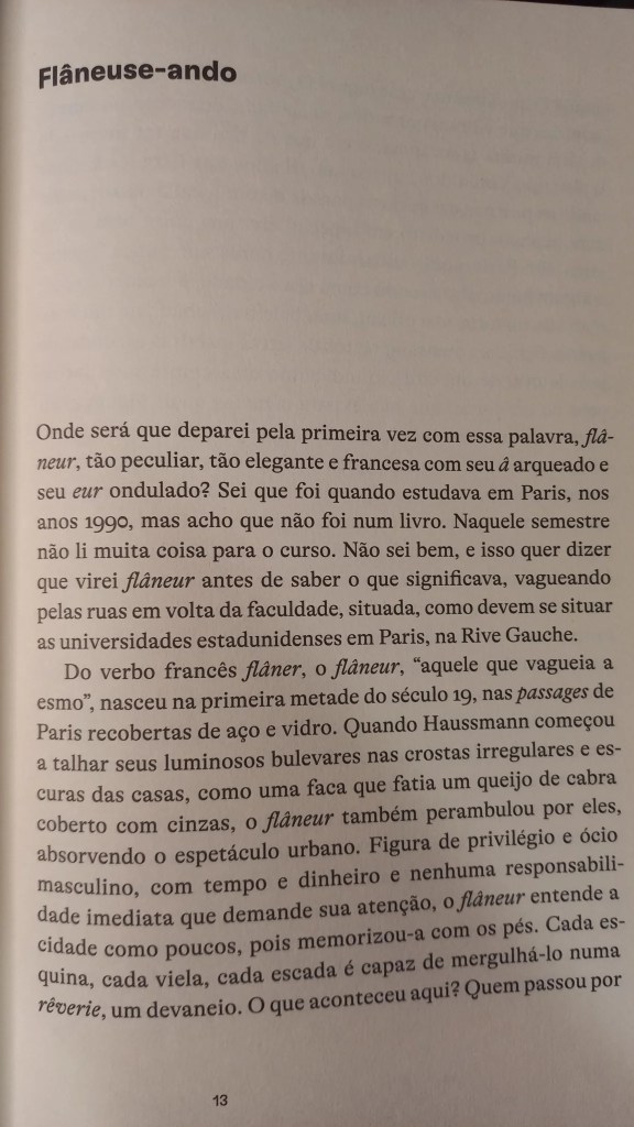 A novaiorquina Lauren Elkin mora em Paris, é escritora, crítica e tradutora, e colabora como New York Times Book Review, frieze e The Guardian. Este ensaio de 2016 saiu aqui no Brasil pela Fósforo e mistura autoficção com uma pesquisa histórica rigorosa, comprovando o que já suspeitávamos: como sugerem os escritos de Jean Rhys, George Sand, Virginia Woolf, Sophie Calle, Martha Gelhorn, Joan Didian e tantas outras, desde antes do clássico O Homem da Multidão, de Edgar Allan Poe, onde Baudelaire captou a figura do flâneur, as mulheres sempre estavam dando suas voltinhas por aí.