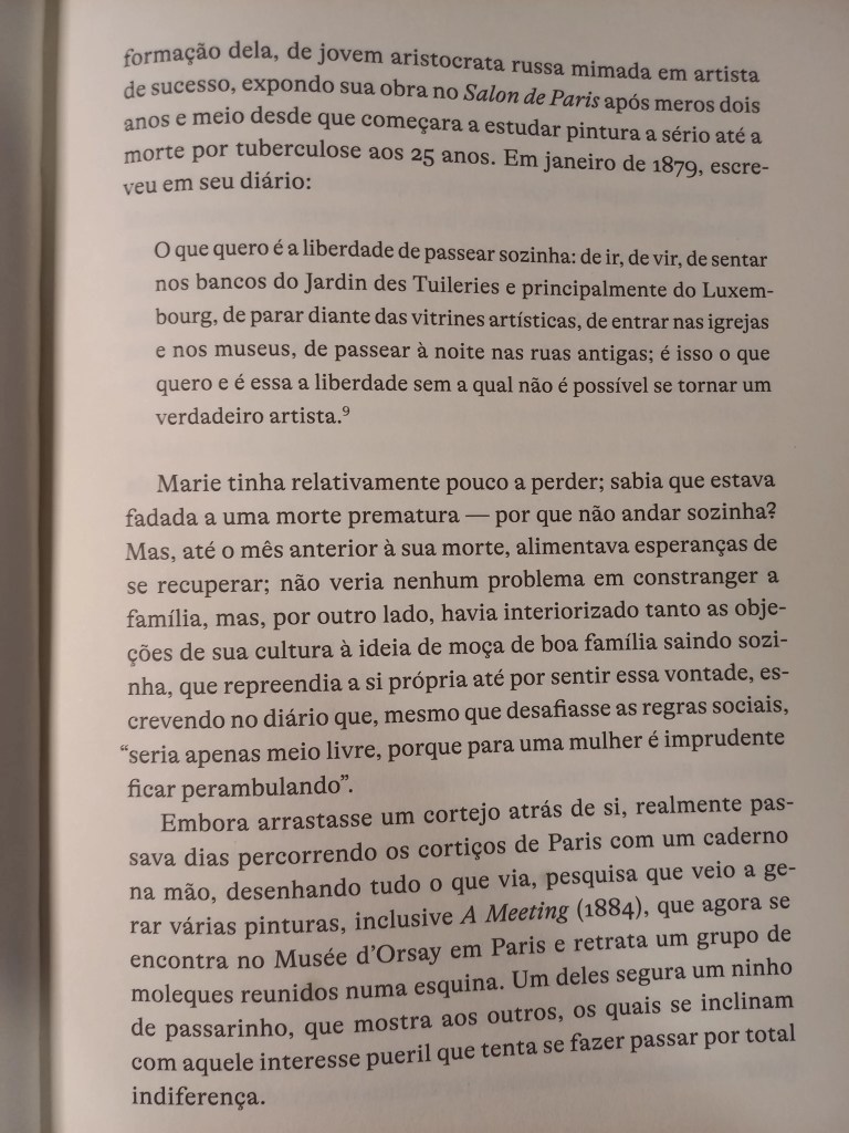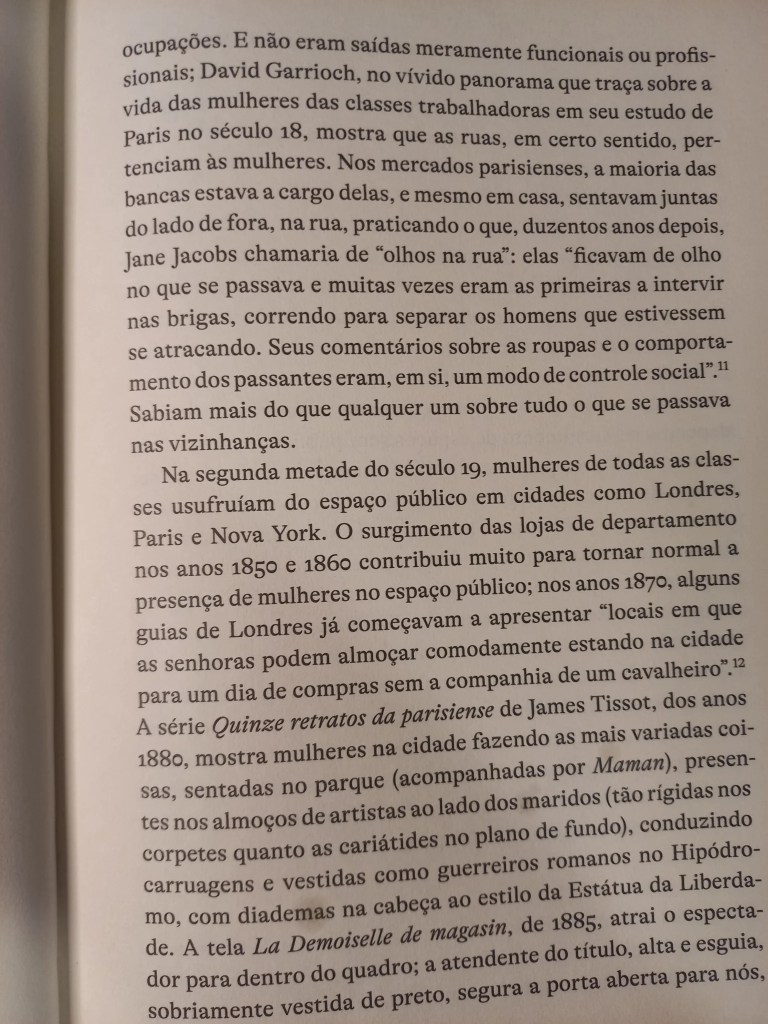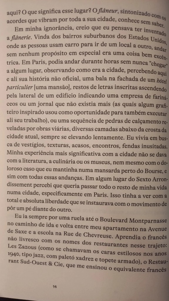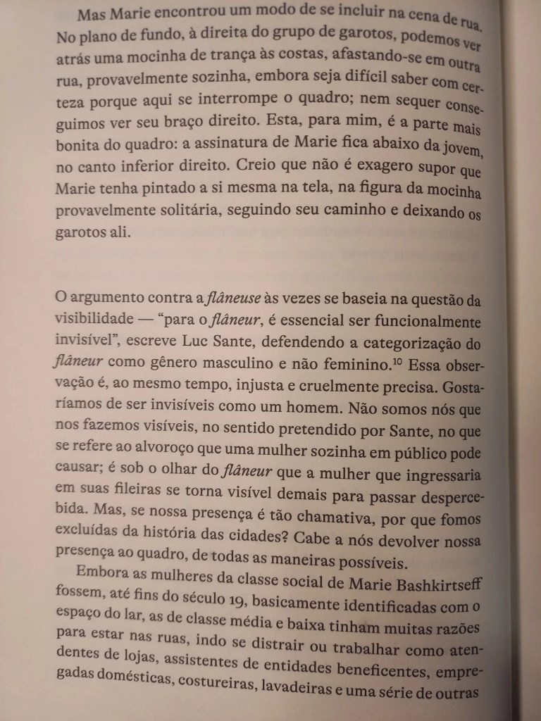 A novaiorquina Lauren Elkin mora em Paris, é escritora, crítica e tradutora, e colabora como New York Times Book Review, frieze e The Guardian. Este ensaio de 2016 saiu aqui no Brasil pela Fósforo e mistura autoficção com uma pesquisa histórica rigorosa, comprovando o que já suspeitávamos: como sugerem os escritos de Jean Rhys, George Sand, Virginia Woolf, Sophie Calle, Martha Gelhorn, Joan Didian e tantas outras, desde antes do clássico O Homem da Multidão, de Edgar Allan Poe, onde Baudelaire captou a figura do flâneur, as mulheres sempre estavam dando suas voltinhas por aí.