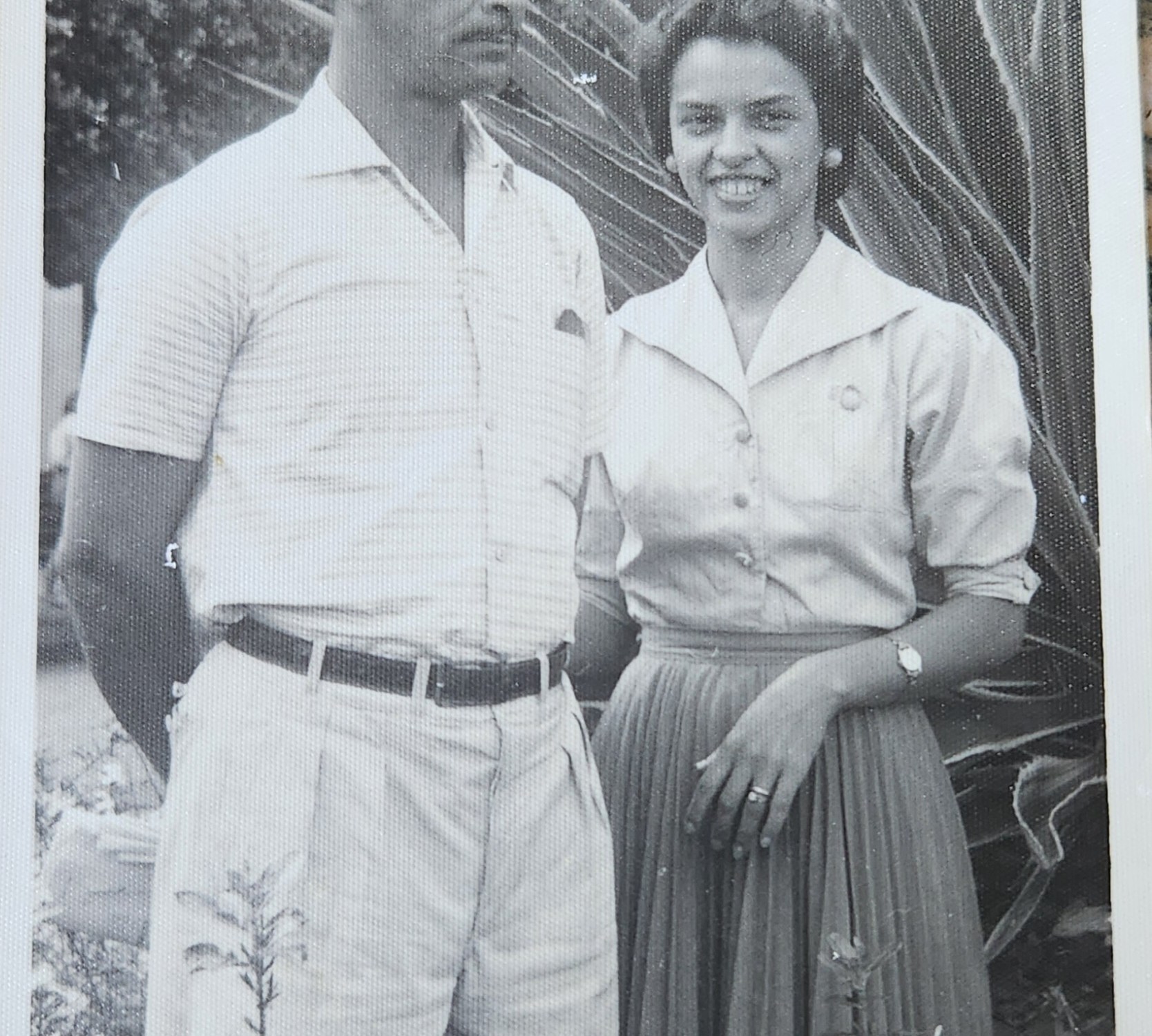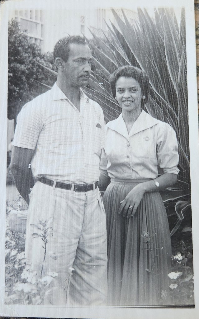 Já perto de fechar o álbum, me apareceu a que me deixou muito curioso. Um homem sisudo e forte, sem olhar direto para a câmera, em uma pose meio militar, ou quase como um segurança, não relaxado, com bigode e lábios finos, cabelo curto e talvez com uns cinquenta anos. Ao seu lado, olhando de frente, uma mulher muito mais jovem, quem sabe a caminho dos trinta, com o que Alceu Valença talvez confirmasse ser um “olhar gateado”, sorriso franco, demostrando estar bem mais à vontade naquele momento, a mão direita atrás do corpo dele e a esquerda relaxada, blusa de botões com gola larga e saia longa, plissada. O relógio pequeno no antebraço combinando com anel e brinco bem discretos. A foto devia ser dos anos 1960, a julgar pelas roupas, mas poderia ser um pouco mais antiga. Como há um prédio alto ao fundo, fiquei com dúvida se estavam em Salvador ou Santo Amaro, onde viviam.