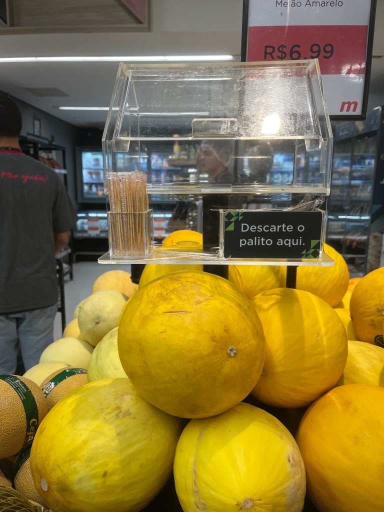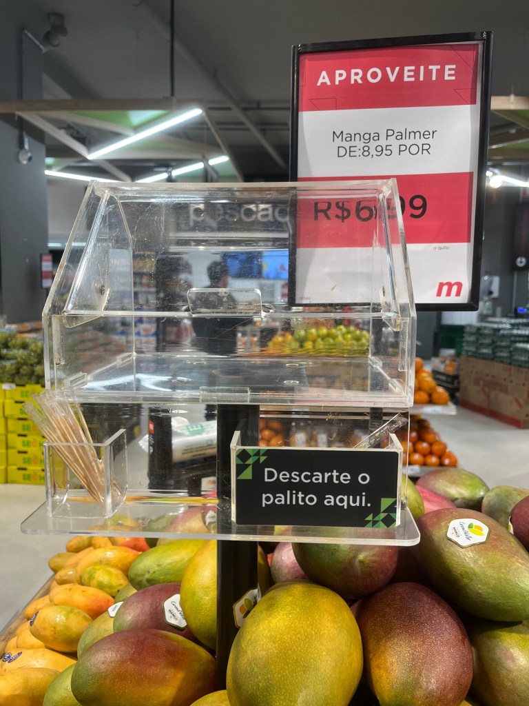 A manga palmer do Mambo custa R$6,99 na promoção, R$8,95 na vida real, porque Paulo, não é São Paulo, e o Mambo também tá longe de ser santo. Quase nove Reais alegando transporte. Como se a manga precisasse de tarifa gold, pra despachar mala e mudar horário de voo sem custos adicionais. Que plantem aqui, não compro. Como melão. Mas só se for de graça, até porque não gosto. É que melão também me lembra Recife e eu como apesar de não gostar. Talvez nem de Recife eu goste.