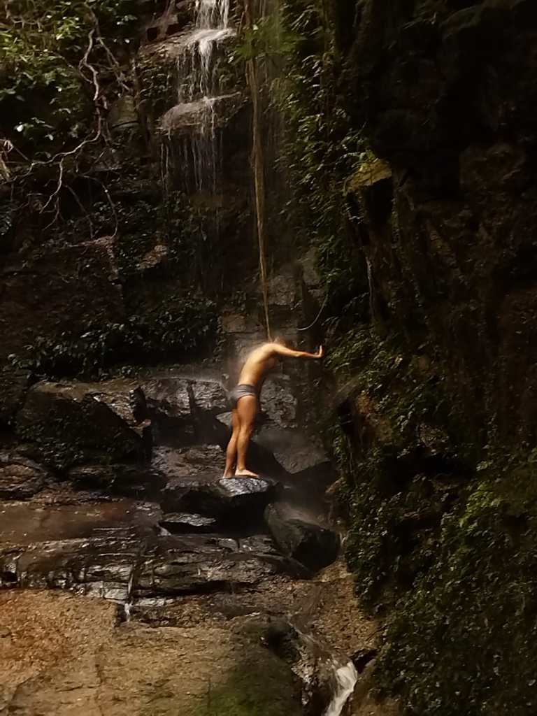 Mãe Fátima, na última vez em que fui ao seu terreiro em Itaguaí, jogou o baralho cigano pra mim e disse que meus caminhos estavam abertos. Se eu tomasse os banhos certinho, mantivesse a fé forte e seguisse tentando, minha vida iria melhorar. Eu tomava os banhos meio errado, rezava de vez em quando, mandava currículo todas as semanas e minha vida seguia na merda. Tomei o banho de Exú de descarrego, saí do chuveiro sem me enxugar e, apesar do cheiro de arruda e alho, seguia me sentindo pesado e desempregado. Talvez pelo fato de que eu seguia com o sono leve e a insônia firme que me faziam acordar depois do meio-dia e me obrigavam a tomar banho quente de chuveiro. Mas alguma coisa naquele banho de folhas, naquelas palavras que repeti antes de tomar o banho ou em algum lugar da minha cabeça desesperado para encontrar algum sentido, me disse pra parar de seguir as mesmas instruções. Então me lembrei de algo que outra mãe, a minha mãe de sangue, me ensinou: é preciso equilibrar o descarrego, se não a pessoa fica sem força. Resolvi recarregar as energias com a água mais poderosa que conheço, nas cachoeiras da Floresta da Tijuca.