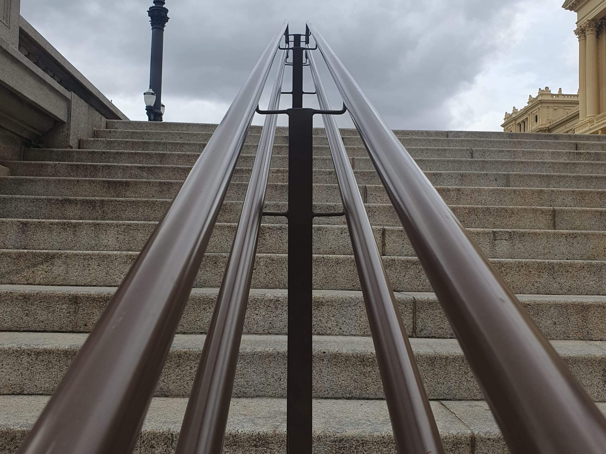De volta à frente do museu, os mesmos grupos de turistas chineses fazem fotos em igual proporção com que fumam. As influencers e os influencers são novidade . Acompanhei uma moça que levava um buquê de balões lilases, montou um tripé e se sentou na ponta da escadaria para as selfies. Imagino que tenha uma página ou um canal com conselhos para se auto amar. Fotografei a moça e por conta destas fotos, consegui uma de que gostei: a imagem dos novos corrimãos nas escadas que ligam os jardins à área do museu. O bronze combinou com a luz de um dia cinza.