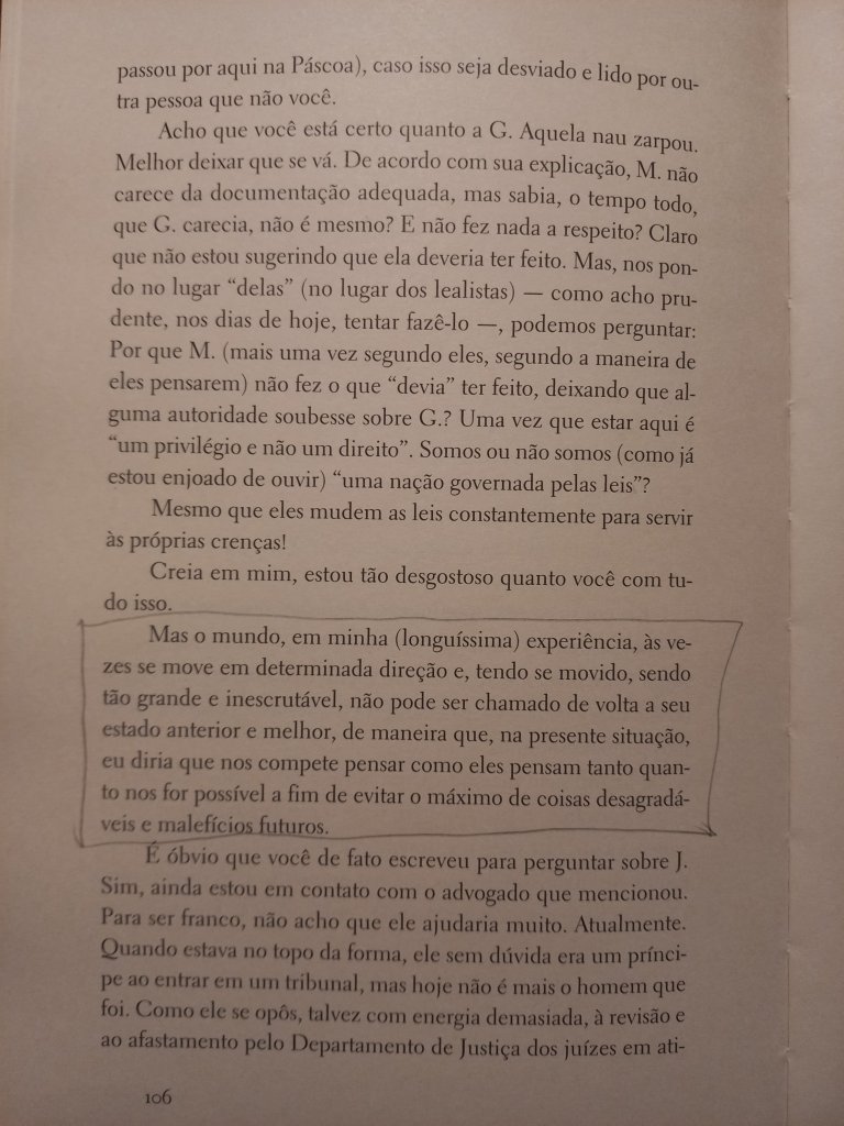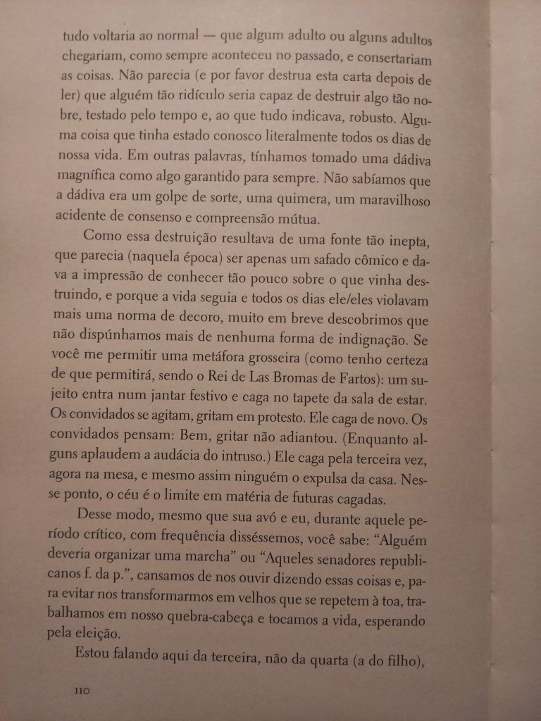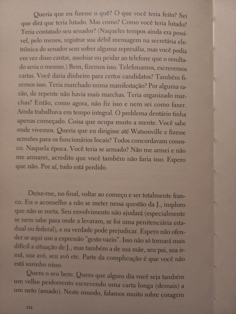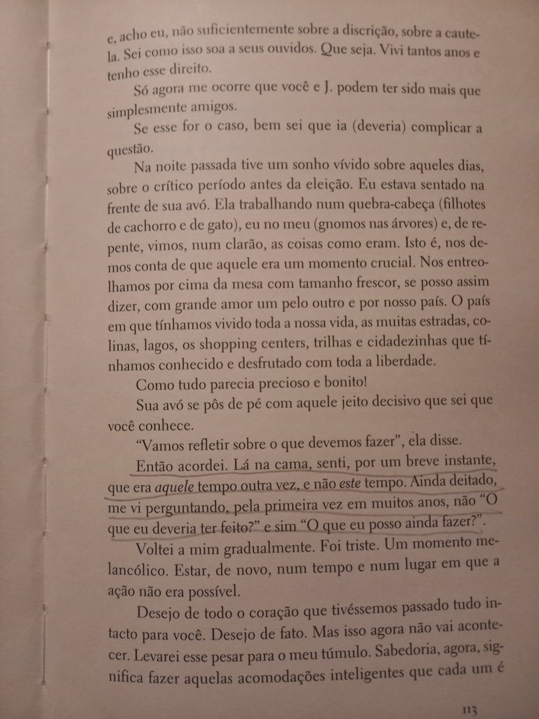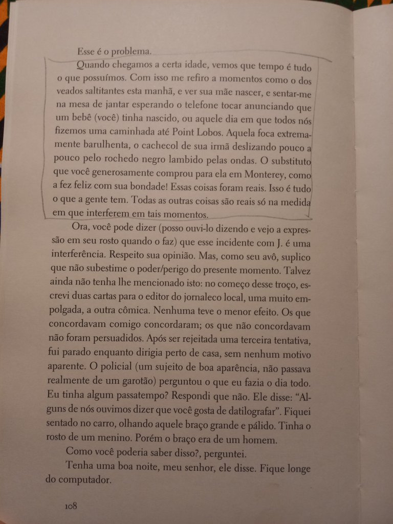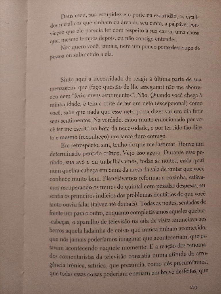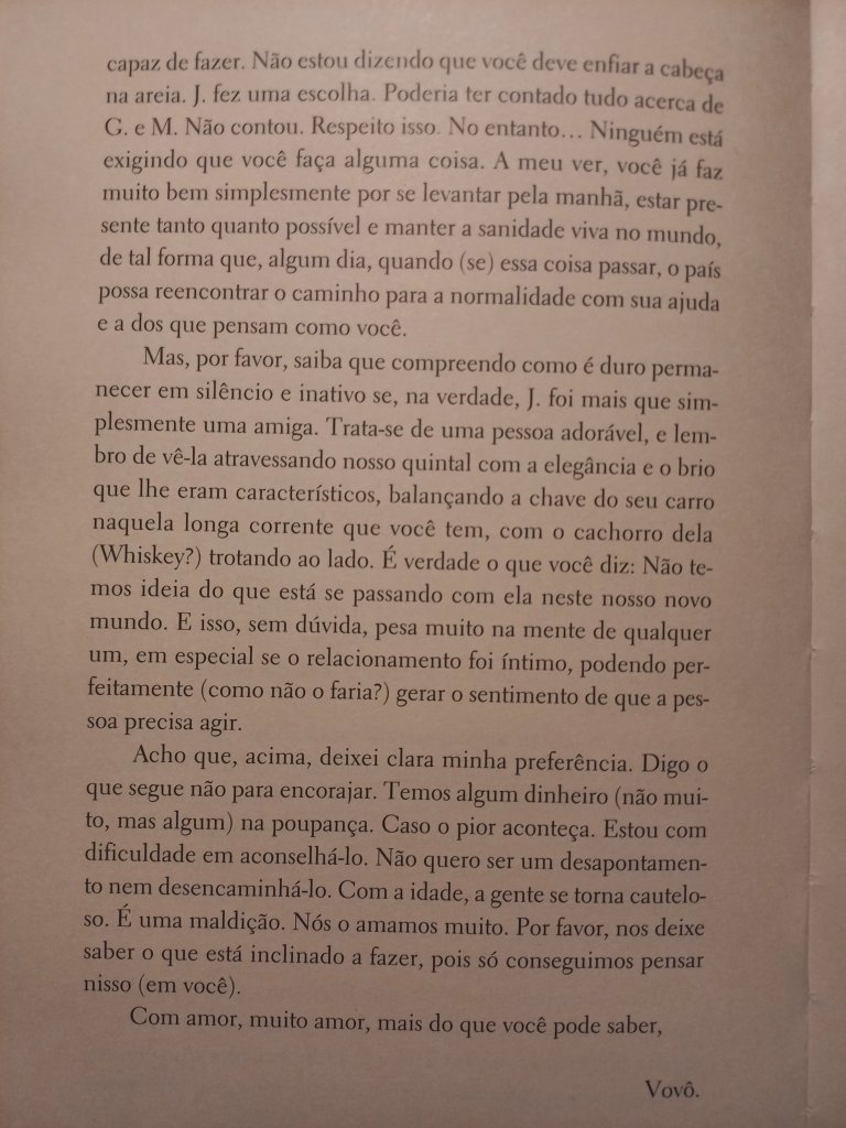 Importante. Não fique só contando coisas que já se passaram. Não se esqueça: é uma carta, mas em ficção, a flecha do tempo corre para a frente, para o futuro, para o que virá. Sem isso, não há tensão.