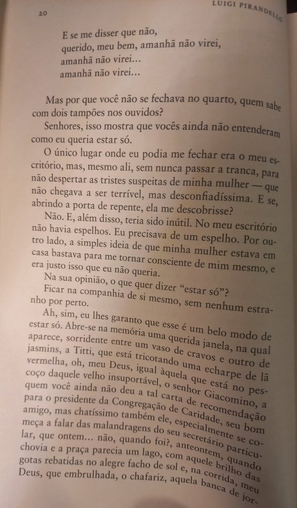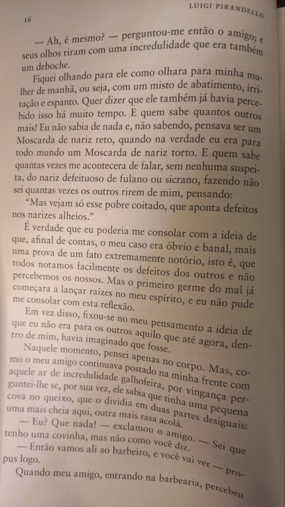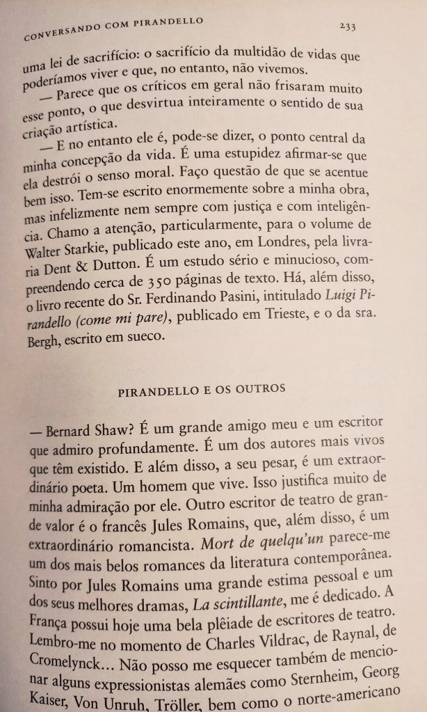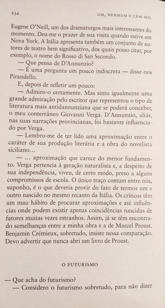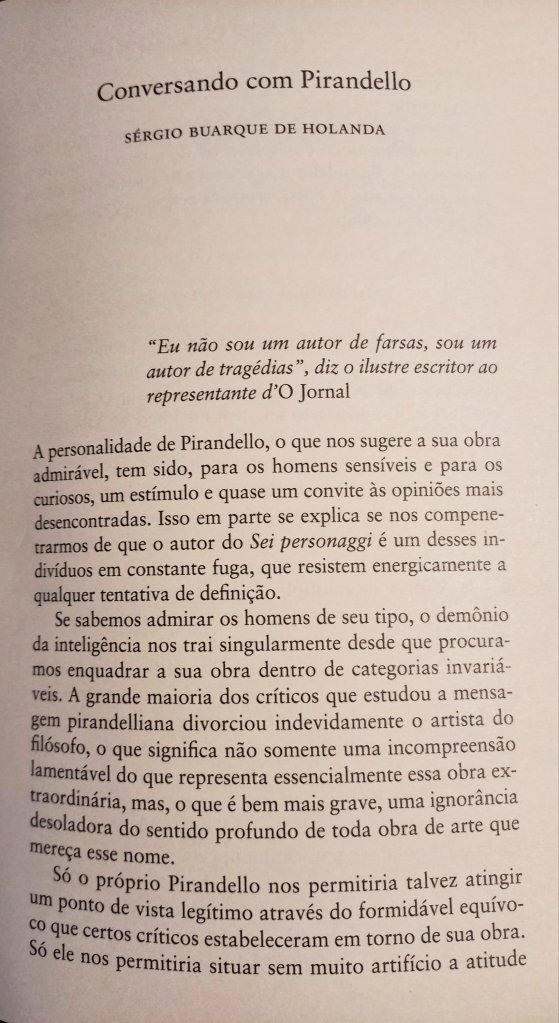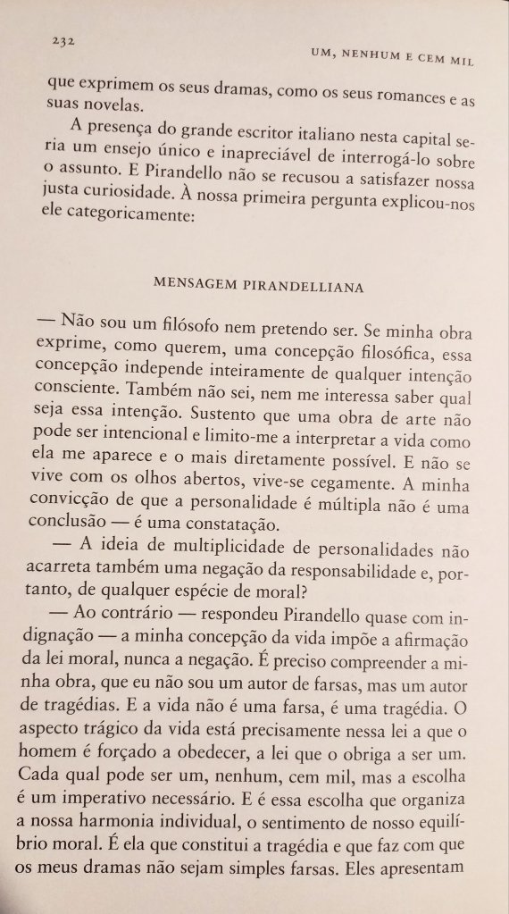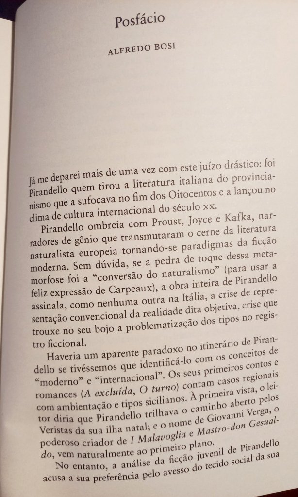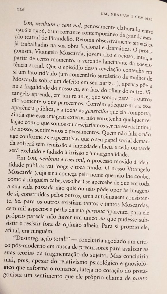 Pirandello é autor de um dos exemplos máximos de metaficção no século 20, Seis Personagens à Procura de Um Autor, já viram? Não é preciso dizer mais nada – a não ser que o maravilhoso Um, Nenhum, Cem Mil, romance que publicou pouco antes de ganhar o Nobel, acaba de ser relançado, com aparatos de Alfredo Bosi e Sérgio Buarque de Holanda, além de nova tradução a cargo de Maurício Santana Dias.