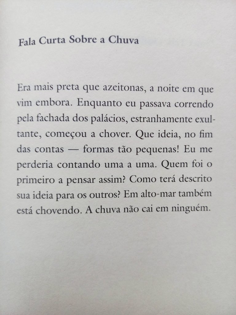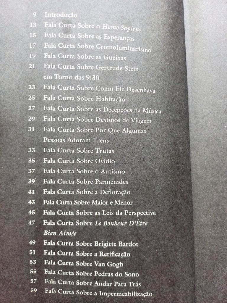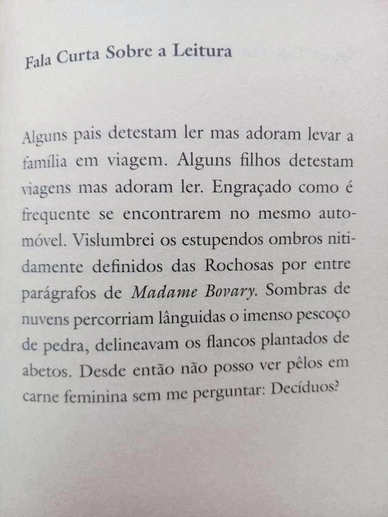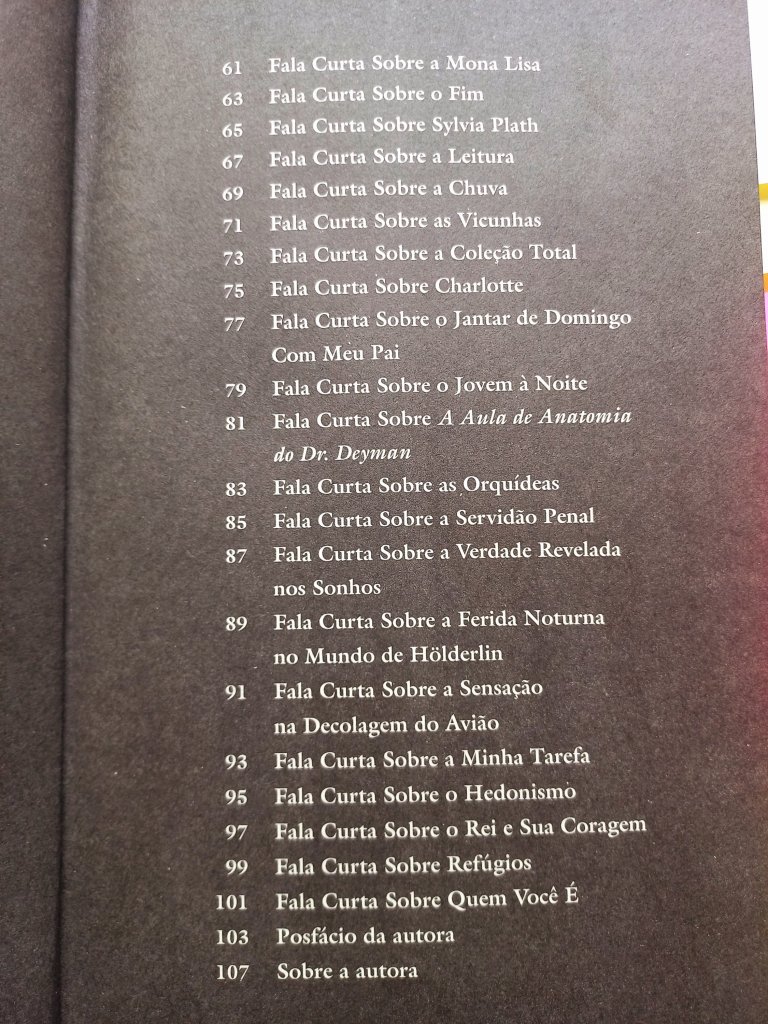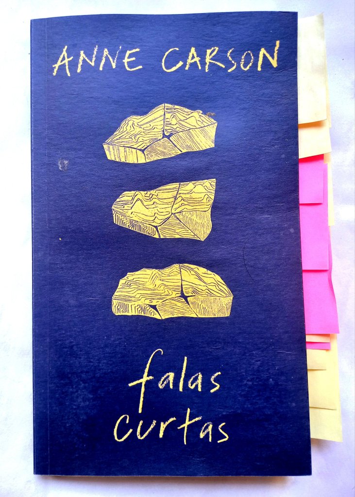 Há alguns anos que a canadense Anne Carson sempre aparece nas apostas para o prêmio Nobel. A tradutora e professora de grego antigo alcançou uma voz muito original com seus ensaios que parecem poemas, seus poemas que parecem narrativas e suas narrativas que parecem ensaios. Tem sido bastante traduzida no Brasil: por aqui saíram o romance em versos Autobiografia do Vermelho e a coleção de ensaios Sobre Aquilo em Que Mais Penso (34), Eros, O Doce-Amergo, seu primeiro ensaio (Bazar do Tempo), O Método Albertine, sobre Proust (Jabuticaba) e este inclassificável Falas Curtas (Relicário), que ficam ali na fronteira entre o microconto, a reflexão breve, o memorialismo e o flagrante lírico, exercitando seu notável poder de síntese temperado com muito bom humor em textos surpreendentes, que pulam de um assunto para o outro sem dar seta.