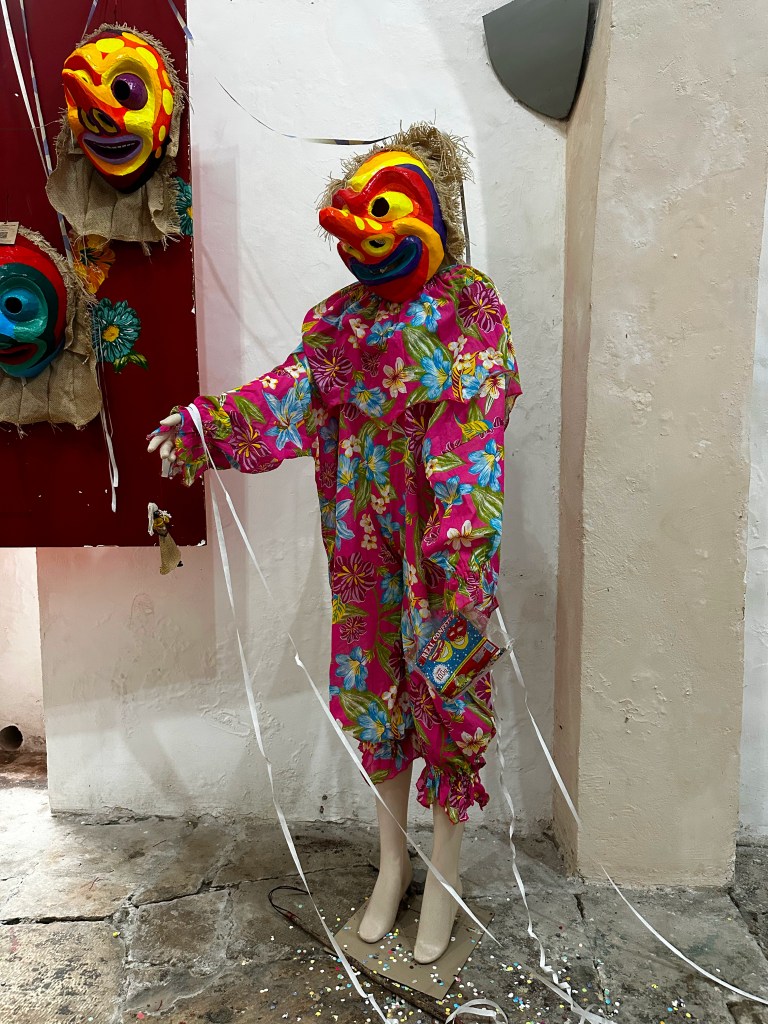 – Na concentração dos blocos de carnaval da praça do Pantheon, numa sexta-feira. Eu, Cláudia e Renata tínhamos nos conhecido na aula inaugural da faculdade de História, não queríamos parecer matutas do interior morando em São Luís. A calourada geral da UFMA já tinha rolado e nenhuma de nós tinha conseguido ficar com ninguém na festa. Nosso desespero pra perder a timidez e o cabaço só aumentava, então decidimos sair todos os dias daquele carnaval. Naquela sexta, lembro de estar parada ao lado da estátua de Maria Firmina, observando o aquecimento dos Fuzileiros da Fuzarca quando um fofão se aproximou e me deu um susto. Era um fofão diferente, usava as peças tradicionais, macacão de chita com chocalhos costurados nas mangas e nas pernas, segurava a bonequinha em uma das mãos e uma varinha na outra, mas ao invés da máscara feia de papel machê, usava uma de escrava Anastácia, cobrindo apenas a boca com uma placa cheia de furinhos pendurada por duas finas tiras de couro passando pelas laterais da mandíbula e outras duas tiras contornando o nariz e passando pelo meio da testa até a parte detrás da cabeça, onde se unia as outras.