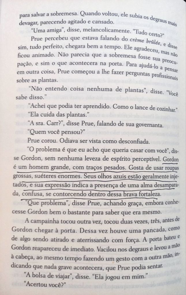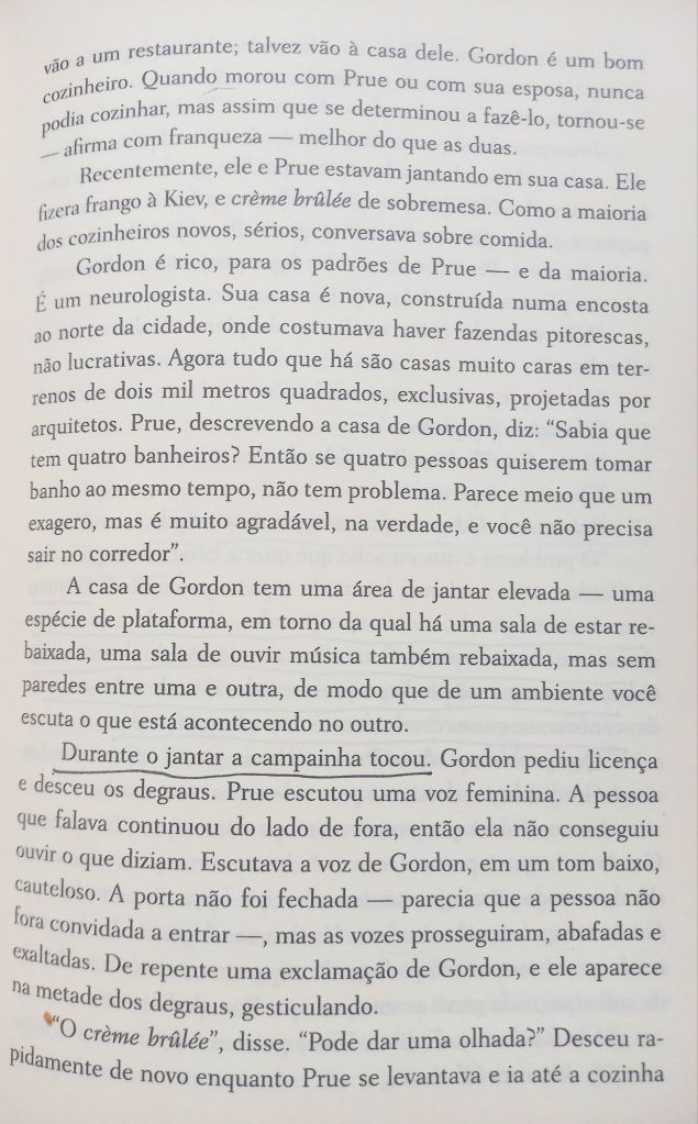 Na primeira cena, o jantar que Prue está tendo com seu namorado é interrompido por um pequeno escândalo. Munro é tão astuciosa que nem sequer revela exatamente o que aconteceu nem mostra o escândalo, apenas o coloca do ponto de vista da personagem.