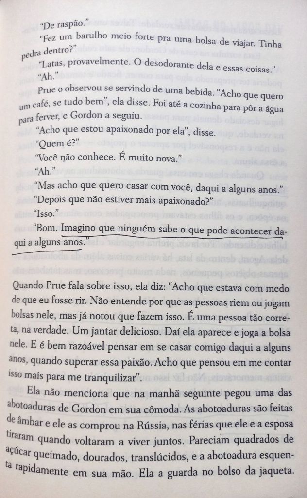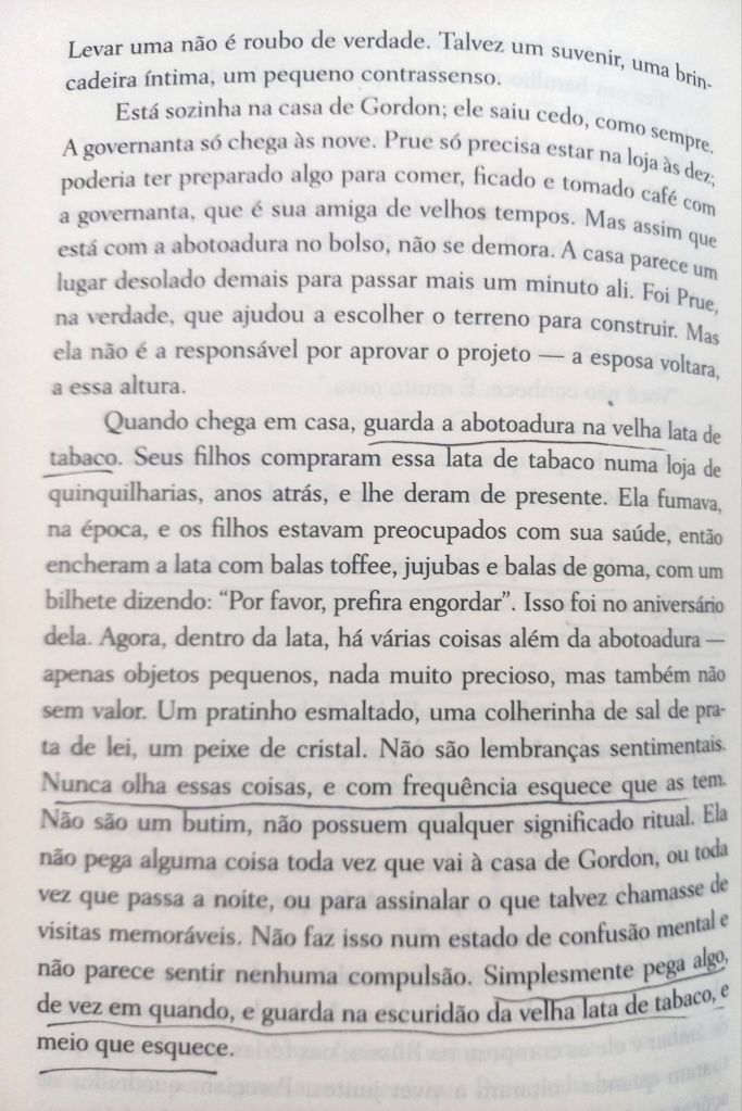 Finaliza o texto com outra cena, esta mais misteriosa. Aqui tem lugar uma especialidade de Munro: a atenção ao detalhe – no caso, algo bem pequeno mesmo, uma única abotoadura. mas que de algum modo concretiza no leitor o modo que Prue vê o mundo: “simplesmente pega algo de vez em quando e meio que esquece”. Poderia usar essa sentença como um resumo do modo como Munro escreve ficção.