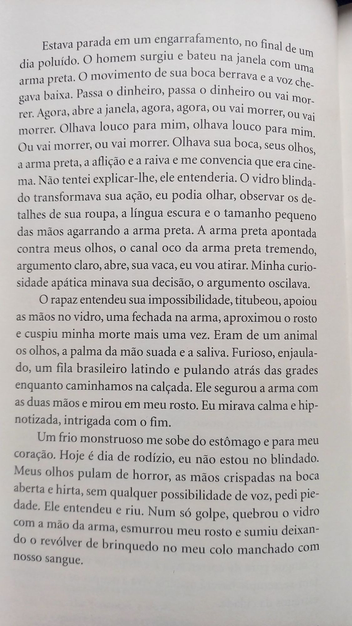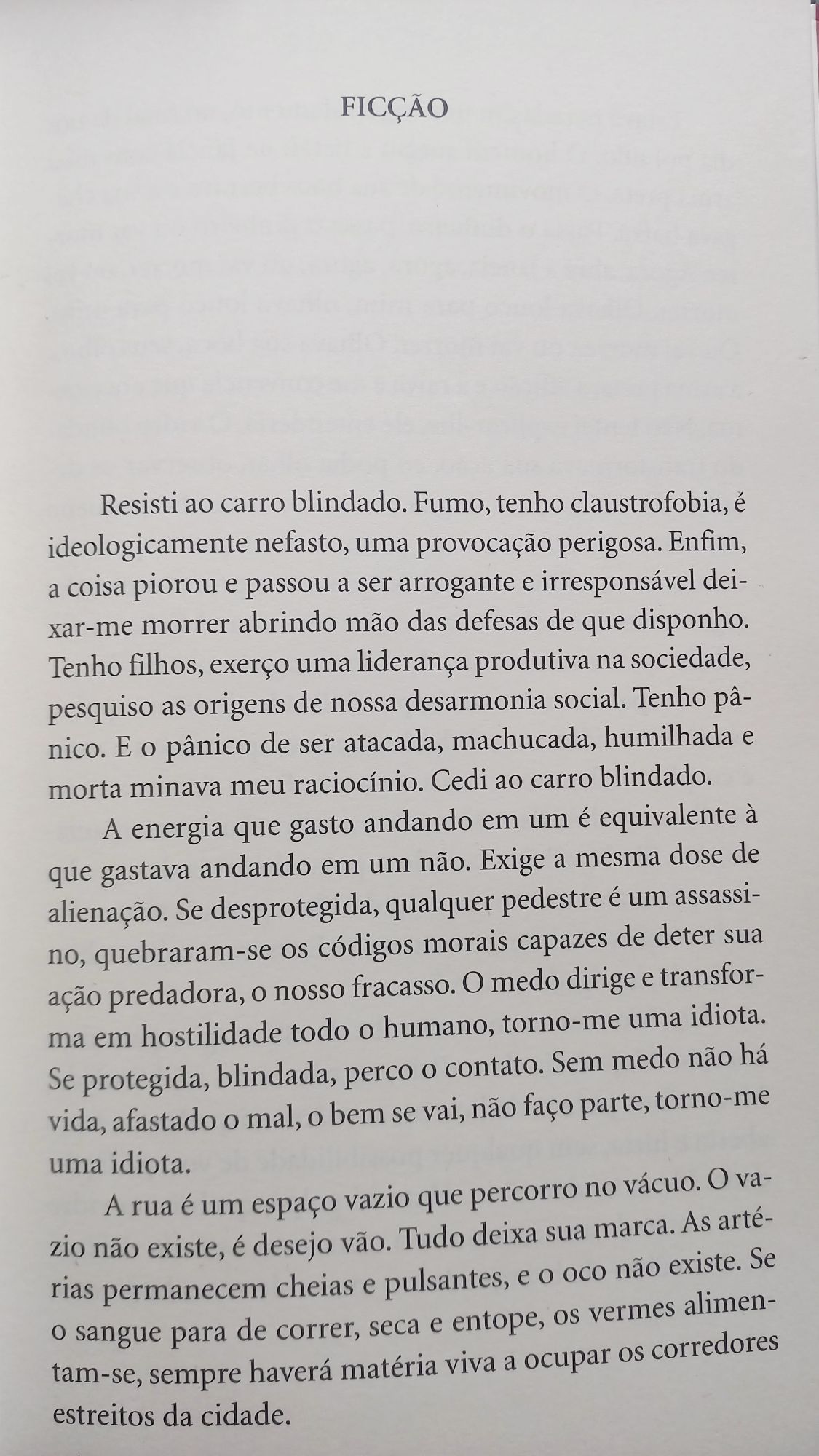 Este conto perfeito traz uma história muito simples, cujo conflito se introduz pouco depois do meio e cujo desfecho é implacável no último parágrafo. O título é enganoso, mas sugestivo. Uma mulher da classe alta, não totalmente alienada do estado de violência devido à desigualdade, porém morrendo de medo de ser assaltada, acaba “cedendo” ao carro blindado. A mulher anônima passa metade do conto se justificando (na primeira pessoa, no passado). Porém um dia, parada no sinal, um homem bate em seu vidro com um revólver, ordenando-a que o abra. Fascinada com o espetáculo da violência tão perto, sentindo-se segura pela blindagem porém hipnotizada, encara o homem, que vai ficando furioso. No entanto, quando tudo parece se resolver bem para a mulher, ela se lembra de que justamente naquele dia saiu com o carro não-blindando, pois é dia do rodízio. Ou seja, ela realmente pode morrer – esta lembrança é narrada no presente. Pede piedade ao ladrão. O homem então tem uma atitude inusitada: quebra o vidro do carro com o revólver e foge – e a mulher percebe que o revólver era de brinquedo. O que justifica o título “Ficção” mas acrescenta outras camadas: seu medo também não seria uma ficção? Ou seria também ficção a sensação de estar protegida por uma blindagem? Uma blindagem não seria uma espécie de ficção?