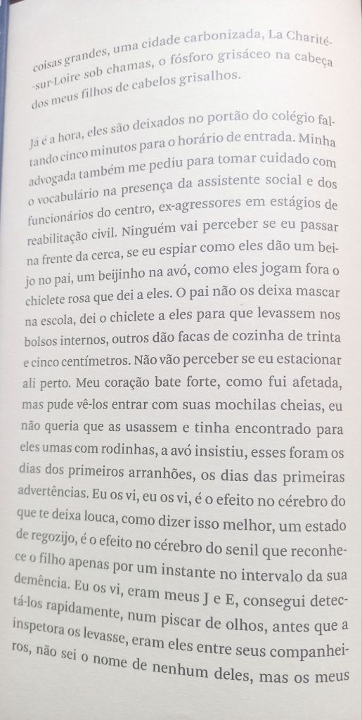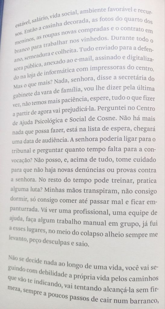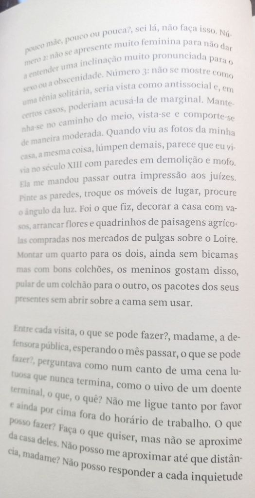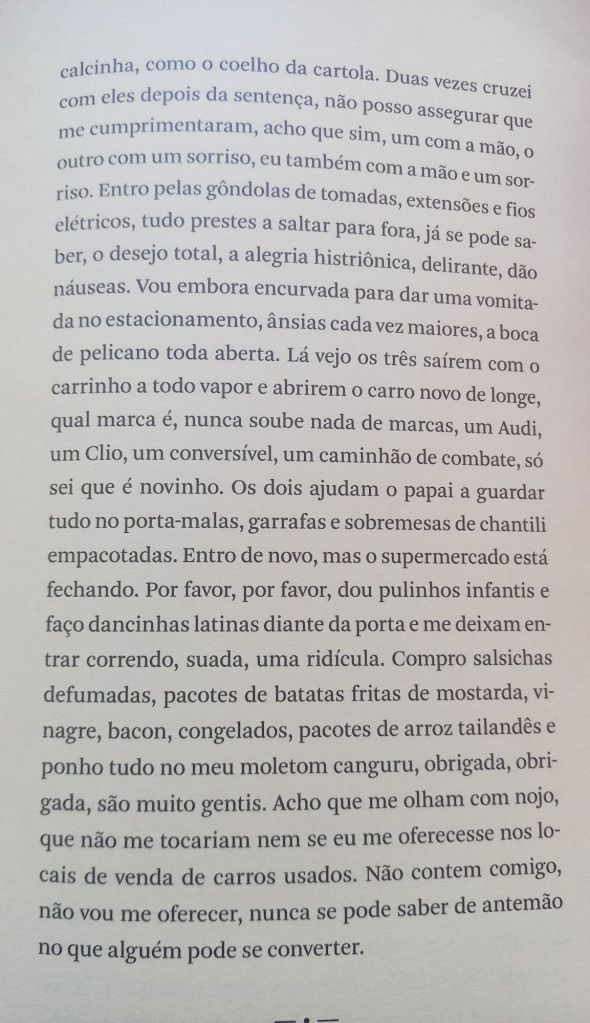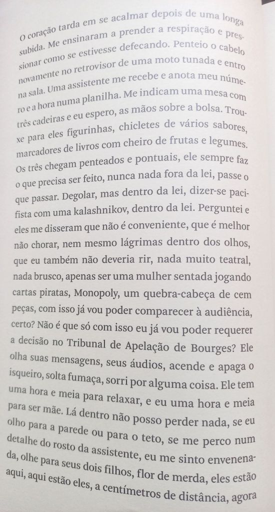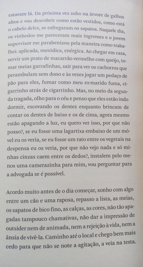 O mais desconcertante na escrita de Harwicz é o fato de ela esconder do leitor o que está acontecendo para focar em acontecimentos anteriores ao seu surto. A velocidade com que conta nos desnorteia, mas ao mesmo tempo sua narrativa hipnótica segura sua narrativa e nos mantém intrigados tanto sobre as causas do seu surto quanto o que foi realmente que aconteceu. Ela opera portanto em dois tempos simultâneos: no presente-agora e no passado imediato. Essa é a chave para a tensão de seu relato.