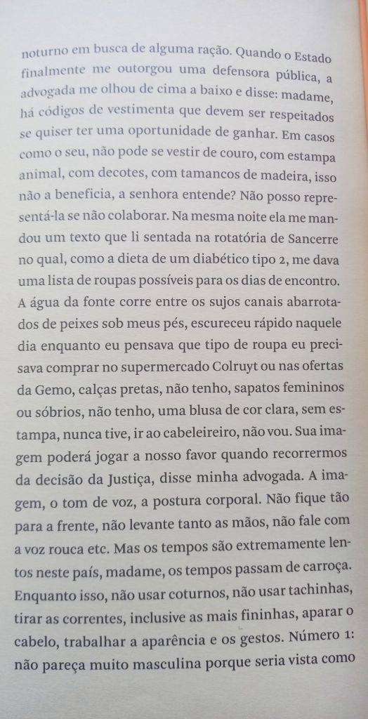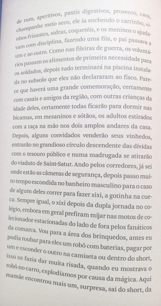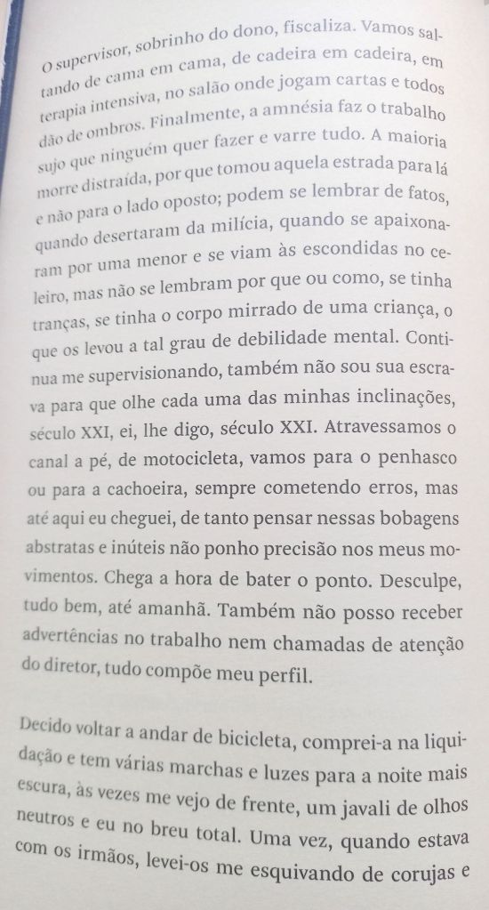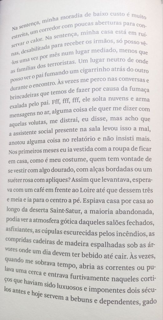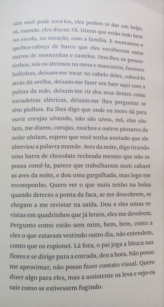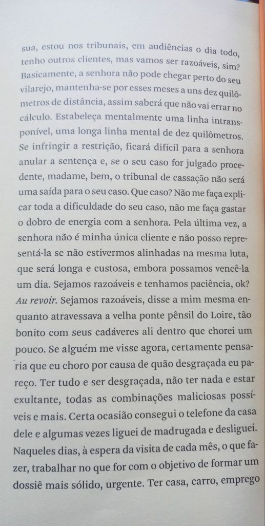 O mais desconcertante na escrita de Harwicz é o fato de ela esconder do leitor o que está acontecendo para focar em acontecimentos anteriores ao seu surto. A velocidade com que conta nos desnorteia, mas ao mesmo tempo sua narrativa hipnótica segura sua narrativa e nos mantém intrigados tanto sobre as causas do seu surto quanto o que foi realmente que aconteceu. Ela opera portanto em dois tempos simultâneos: no presente-agora e no passado imediato. Essa é a chave para a tensão de seu relato.