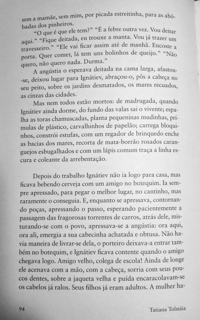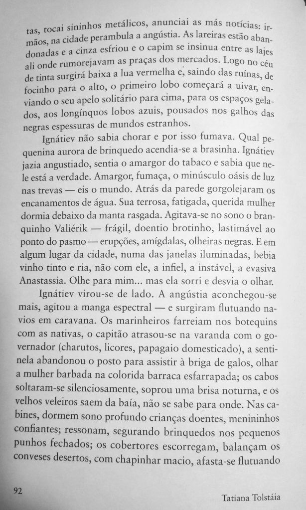Tolstaya deixa bem demarcadas as diferenças de idade e de gênero, e é possível delinear dois movimentos em relação a homens e mulheres na sua narrativa: homens marcados pela infância, ainda presos a ela, e mulheres com uma vida à espera; homens presos ao passado, mulheres presas ao futuro. Tanto em “Durma bem, filhinho” como em “Peters” os personagens principais são homens com uma infância perdida, órfãos procurando um lar. O primeiro consegue, de certa forma, encontrar o que procura, mas o segundo é de tal forma rejeitado que não consegue atingir maturidade para enfrentar a vida adulta. É desse conto um dos trechos mais belos e tristes que li no livro: