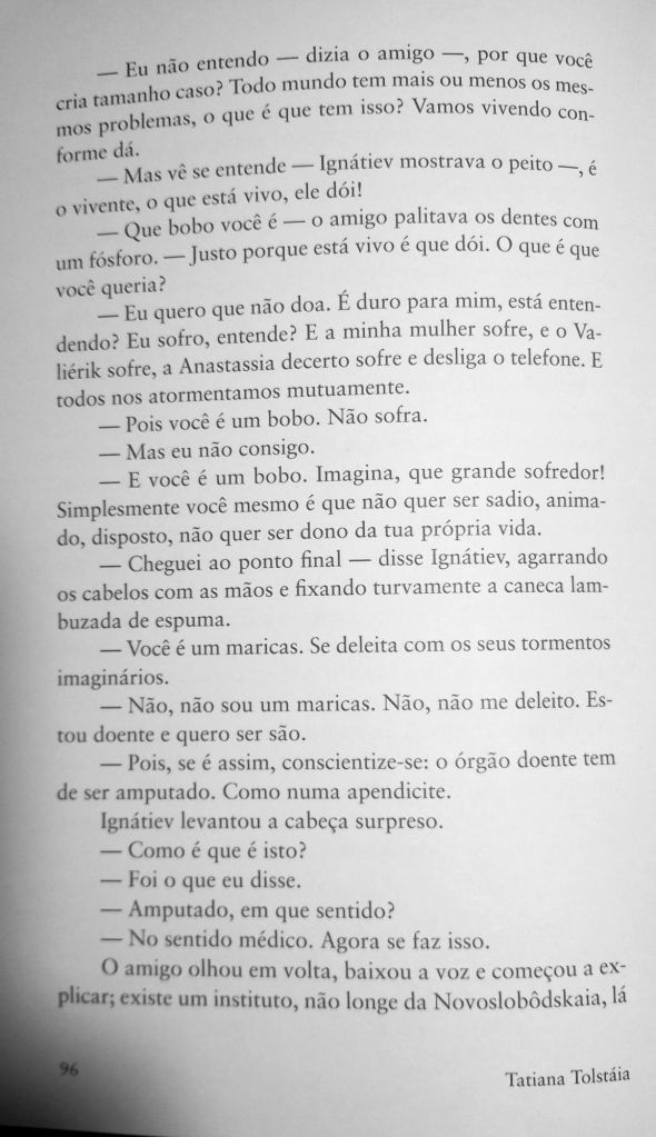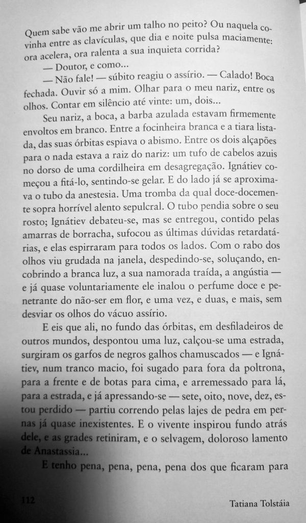 Além das crianças, Tolstaya apresenta também personagens com idade avançada, pessoas que já estão num momento de reflexão ou de lembranças doloridas. Em “O círculo”, um homem de sessenta anos, ao esperar sua mulher num salão de beleza, visualiza todo o caminho da sua vida, as amantes que teve e a inusitada maneira como as conheceu, e a sensação de que nada de especial aconteceu e nem acontecerá. Já em “Shura querida” temos uma velhinha cuja vida se encontra suspensa, dedicada aos álbuns de fotografia empoeirados e às lembranças dos amores que viveu, mas sobretudo a um amor que não viveu, que ficou esperando por ela. Aqui é especial a maneira como a autora trabalha o desejo de Shura de voltar no tempo: parece que aquelas pessoas que não vemos mais ficam paradas no lugar onde as vimos pela última vez.