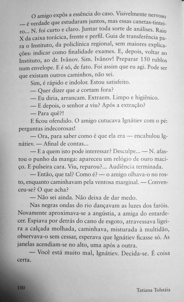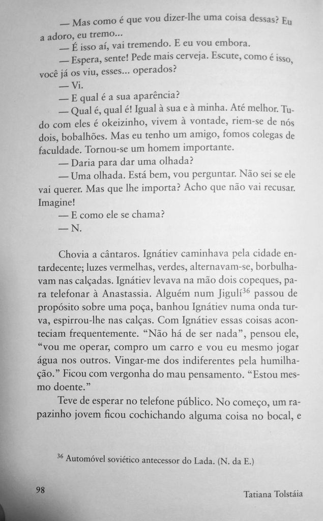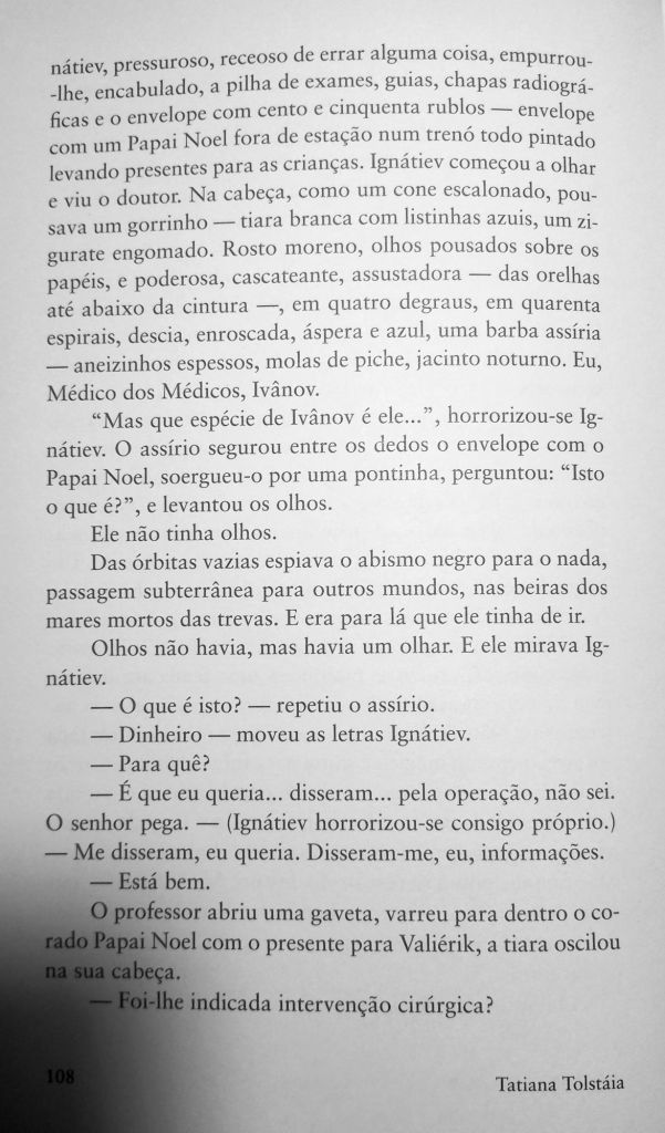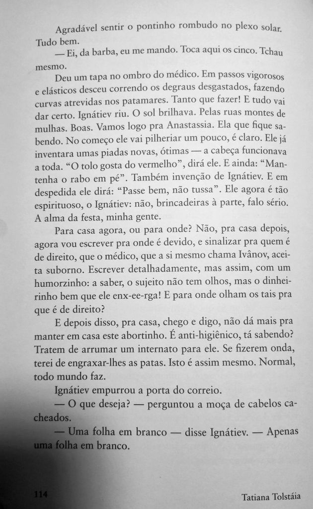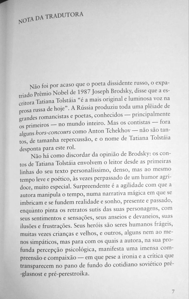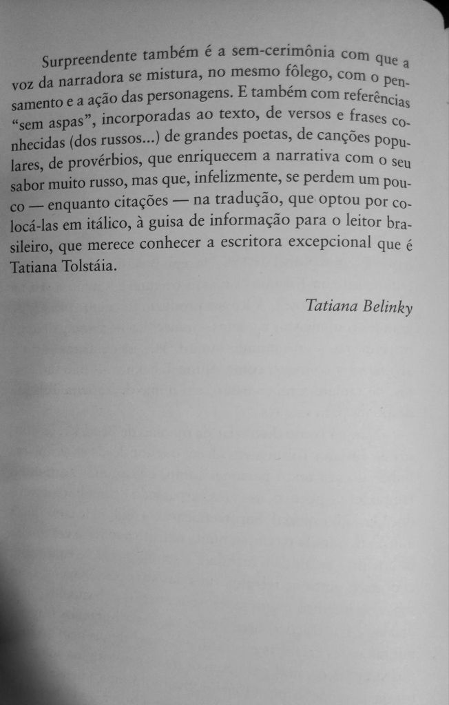 Tatiana Tolstáia é, como o nome sugere, descendente de Lev Tolstói e Aleksei Tolstói, além de vários outros escritores. Russa de Leningrado, 73 anos, publicou o primeiro livro, No Degrau do Ouro, em 1987, o que a torna contemporânea das Liudmilas Petrochévskaya e Ulítskaya. Ao contrário da primeira, não envereda tanto pelo fantástico, e, diferente da segunda, não se interessa tanto pela profundidade psicológica de seus personagens. Investindo num tom entre a fantasia e o realismo mágico, parece se aproximar mais de contos como “O nariz”, de Gógol – bem, como dizia Dostoiévski, “todos somos filhos de Gógol”. Seu forte são histórias meio malucas com crianças viajandonas e velhos angustiados, em que subitamente o tempo cronológico (Chronos) parece invadido pelo tempo mitológico (Kairós). E tudo bem. Suas narradoras são frequentemente bem-humoradas, um pouco na linha de Bulgákov; porém, sua linguagem é muitas vezes barroca, abusando de descrições verborrágicas, torneios verbais e mudanças surpreendentes na dinâmica dos enredos, que são quase atmosféricos. Aqui tem uma boa leitura de todos os contos dessa coletânea, que acaba de sair no Brasil editada pela 34 e traduzida por Tatiana Belinky.