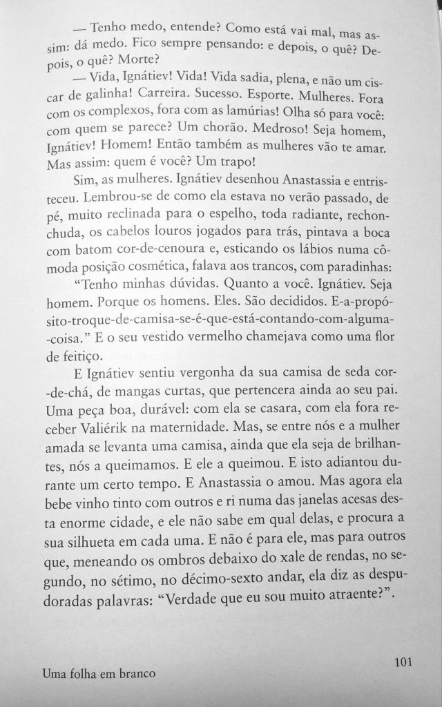 Estes dois contos poderiam também ser classificados entre aqueles que mostram pessoas desencantadas com a realidade, em contraste com todas as expectativas que tiveram, juntamente com “Sônia” e “Rio Okervil”. No primeiro uma mulher considerada burra é enganada por muitos anos através de falsas cartas de amor. O irônico é que a pessoa que as manda, como uma brincadeira às suas custas, acaba se tornando um pouco o personagem que inventou. Destaque para os primeiros parágrafos, com uma linda descrição da tentativa de lembrar de momentos e pessoas há muito esquecidos. No segundo também temos uma história de ilusão, em que um homem apaixonado por uma cantora decadente tem dúvidas se deve ou não ir conhecê-la, se deve ou não ultrapassar a fronteira entre o que idealiza e a realidade. Ainda nessa mesma categoria temos “Caçada ao mamute”, com uma mulher obcecada pelas inúmeras estratégias para obter um casamento com um homem que não suporta e “Uma folha em branco”, com um homem completamente insatisfeito com a vida, que resolve enfrentar uma cirurgia para extrair sua angústia.