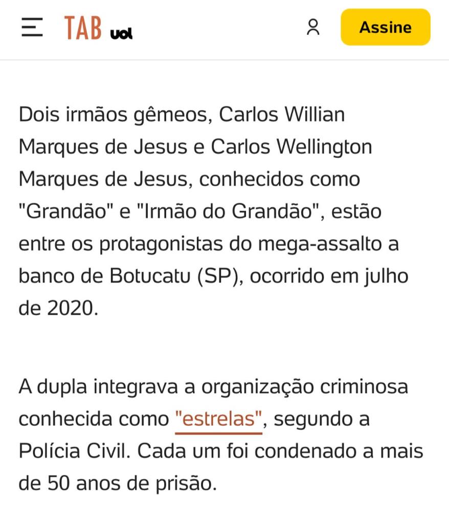 Carlos Willian Marques de Jesus e Carlos Wellington Marques de Jesus, conhecidos como “Grandão” e “Irmão do Grandão”, estão entre os protagonistas de mega-assalto a banco de Botucatu (SP) ocorrido em julho de 2020. A dupla integrava a organização criminosa conhecida como “Estrelas”.