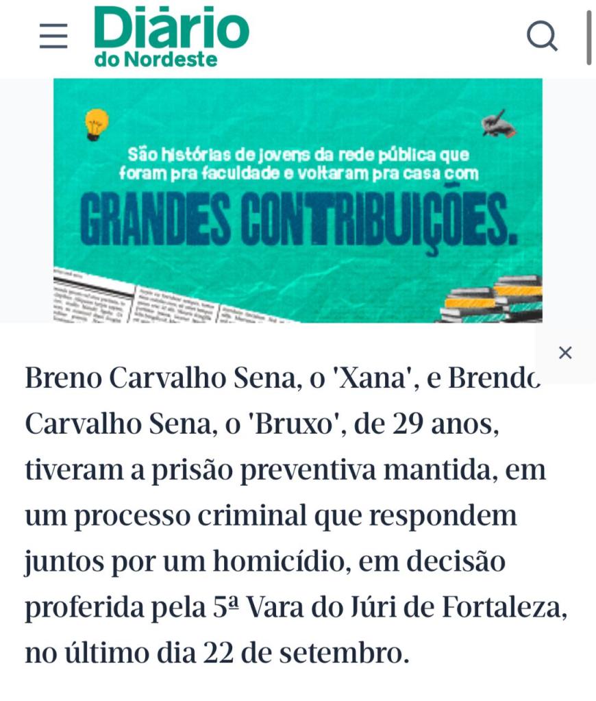 Breno Carvalho Sena, o ‘Xana’, e Brendo Carvalho Sena, o ‘Bruxo’, de 29 anos, tiveram a prisão preventiva mantida, em um processo criminal que respondem juntos por homicídio, em decisão proferida pela 5ª Vara do Júri de Fortaleza, no último dia 22 de setembro. No dia 23, Adelaide Carine, ex-mulher do juiz e também juíza, digitou “Xana e Bruxo” no buscador pra ver se encontrava em algum portal de notícias uma foto do ex incompetente que deve ter usado a sentença escrita por ela mesmo depois de pedir o divórcio. O celular que não estava no silencioso tocou para todo o prédio do Fórum Clóvis Beviláqua ouvir A nossa Tropa é 157 de Xoxota dos djs Jn 22, o Bruxo e Tambor Xana